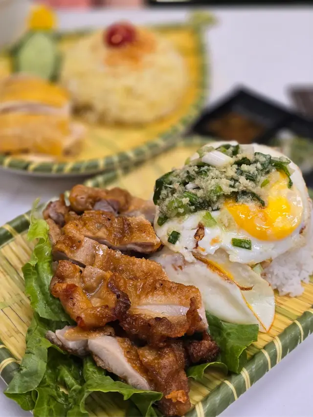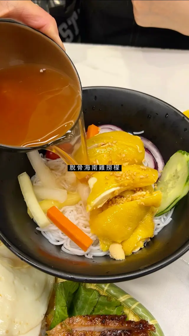 經過這家店,看到海南雞飯就讓人垂涎欲滴,雖然餐廳很忙,但老闆對客人很有禮貌,用餐體驗很好。招牌脫骨海南雞飯 $99小編點了一個海南雞飯套餐,使用了無激素的海南雞,雞皮爽口,肉質嫩滑,搭配了油飯,香氣撲鼻。套餐還包含了燉湯,點了一個五指毛桃燉海底椰,清香爽口。飲品則需額外+$8,桂花烏龍茶香明顯。醉香花雕雞配飯 $75朋友點了花雕雞配白飯,花雕雞帶有酒香,突出了雞肉的嫩滑和清爽口感,適合夏天食用。燉湯(+$60)花旗參鮑魚紅棗燉唐排,清甜中帶有淡淡的花旗參味。飲品白桃烏龍茶,桃香淡淡,清新解膩。蔥油香烤雞髀煎雙蛋飯 $60兩個太陽蛋放在白飯上面,一邊是大量的蔥油雞髀,蛋黃微微流動,雞髀烤得入味,加上蔥油很美味。香煎蓮藕餅 $32本來想點墨魚餅,但今天沒有了,不過蓮藕餅也很好吃,大量的肉碎包裹著蓮藕,入口肉香滿溢,蓮藕爽口。手拍青瓜 $32青瓜清爽,配上口水雞醬汁,味道香濃。馬來黑叉燒 $32叉燒薄身軟嫩,蜜汁味淡淡的。餐廳最近在做優惠,星期六日和公眾假期全日套餐第二份半價!有興趣的話可以去試試看~查看更多
