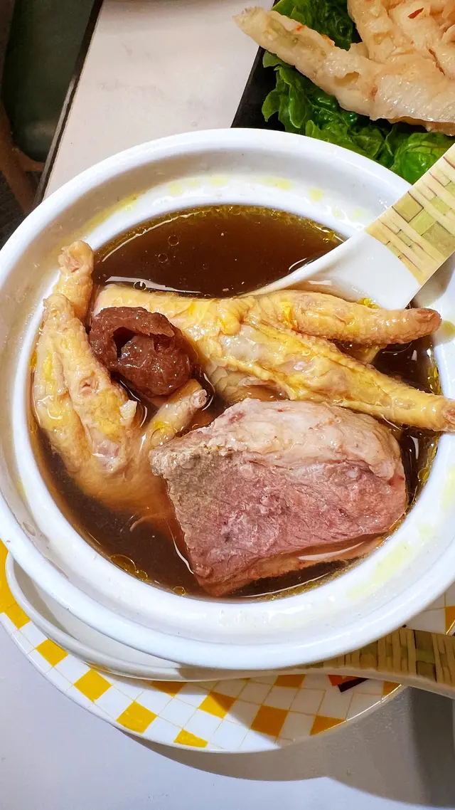 大病初癒朋友,為了健康,堅持食無激素雞,還特意推介瓊天,激讚這裏的海南雞,是夜特意前來一試 🥰🥰小餐廳的布置還算有心思,座位寬敞舒適。點了海南雞拼肉骨茶 $88,追加菜心及凍檸茶。餐廳選用無激素去骨海南雞,有驚喜!肉質嫩滑有雞味,甚為難得的高質雞飯。肉骨茶藥材味濃郁,絕無欺場!👍👍小食大滿貫,點了藕餅、鴨舌、黑叉燒及豬手,真是小錢大滿足!香煎蓮藕餅4塊 $32 ,豬肉餅有質感,有蓮藕粒粒,爽口。花雕醉鴨舌$32 ,鴨舌爽身,花雕味道濃郁,真材實料。馬來黑叉燒$32,口感跟傳統叉燒有點不同,有新意!蒜泥無骨豬手$32,蒜泥帶辣,去骨方便進食,有咬口,味道不錯。泰式豬頸肉飯$60,加$20有芥蘭及凍檸茶。豬頸肉煙煙韌韌,加上吸睛太陽蛋,絲苗白飯,正!枱面上的醬油,必食必食,味道帶點甜味,加在任何食物上都好味。追加燉湯花膠螺頭桂圓湯$60,燉湯清甜滋潤,湯料足,輕易食到有花膠、螺頭,桂圓 👍👍海南雞出色,不枉此行!查看更多