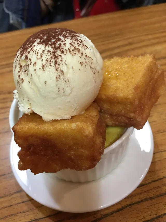 快十一点摸到这吃点东西,正好把一把硬币用出去,多谢店家收了30的2元,怪不好意思的ヾ(´▽`;)ゝ要的是雪糕西多士,实际上是雪糕西多士烘蛋。现做的,做的时候就闻到一阵奶香,第一口雪糕也很醇。但是由于三种材料的性质和位置关系,只能一种一种的吃。想把多士和雪糕一起吃,却把雪糕叉到了蛋上,蛋是热的,不一会儿就化了好多。最后是先吃了两块多士,又吃了和着半融雪糕的烘蛋,最后两口有些腻了。或许还有下次试试紫薯心太软。查看更多