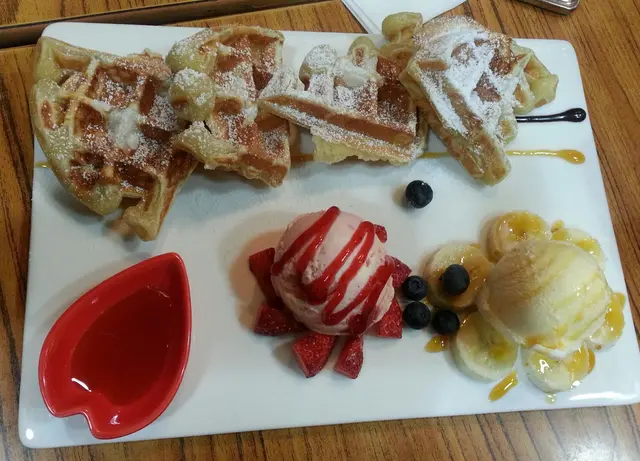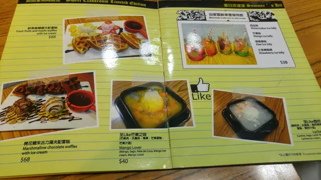 食完新潮tapas之後, 仲想同啲朋友傾下計, 上網就搵到呢間甜品店喇。甜品店以校園為主題, 座位係學校嘅枱同凳, 仲有個黑板喺牆上做menu, 寫左有啲咩推介。裝修都幾得意。menu外表係以前讀書時嘅單行簿, 貫切呢度嘅主題。Tiramisu: 賣相好得意, 好似一座小山丘。食落味道唔錯, 甜味啱啱好, 咖啡味都香濃, 唯一美中不足係雪得太硬喇, 食到中心時, 好冰凍, 影響左成個甜品嘅口感。綠茶心太軟配紅豆雪糕: 熱辣辣上碟, 切落去見到啲綠茶漿流緊出黎, 好滿意, 收貨。趁熱食, 綠茶味唔算濃, 甜味適中。作為綠茶控嘅我會認為唔夠綠茶味, 我比較鍾意帶有甘味啲綠茶甜品。紅豆雪糕紅豆味都足夠, 唔太甜, 配埋心太軟一齊食, 冰火口感, 正。麻糬窩夫配雪糕: 賣相唔錯, 叫呢個窩夫完全比麻糬呢2個字吸引。窩夫淋上糖漿, 單食都唔錯, 窩夫軟身, 面滿滿麻糬, 食落好QQ, 都好滿足。士多啤梨味雪糕同雲尼拿雪糕都唔錯, 仲有少少生果食! 如果窩夫係脆身就更好~查看更多