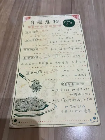 小店面積細,座位不多,光顧的多數是附近的居民,大家都不太介意桌子和椅子之間的距離很接近。今天點了蜆肉鮮菇片少少辣香蒜汁意粉,另加了菇湯。意粉偏軟,但又不至於太軟,份量很多,蜆肉和鮮菇也很多。醬汁蒜蓉味香,真的只有少少辣,下次我可以試小辣。菇湯有香濃的菇味,而且湯裏滿是切得細碎的菇,口感也很好,我覺得這兒的湯真的是很好味。這店的一個特色是牆上、餐牌甚至紙巾盒上都是店家手繪的圖案,很漂亮。店中由一個店員負責落單、送餐和結帳,他工作效率很高,也很有禮貌。