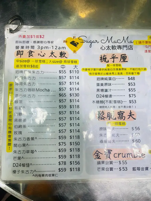 今次嚟到位於屯門好出名嘅紅橋附近Sugar Ma Ma食甜品,小店以即食心太軟為主打,口味足足多達17款,好吸引,深受附近街坊喜愛。招牌原味朱古力心太軟心太軟即叫即焗,口感外脆内軟,切開之後中間流心好澎湃咁流出嚟,朱古力味道香醇,配合自家製伯爵茶雪糕,口感冷熱交融,好特別,而心太軟可以配搭多達12款唔同口味嘅雪糕。招牌純蛋白梳乎厘梳乎厘外脆,內裏口感鬆軟,帶有香濃嘅蛋白味,味道唔會太甜,空氣感十足,濕潤度啱啱好。查看更多