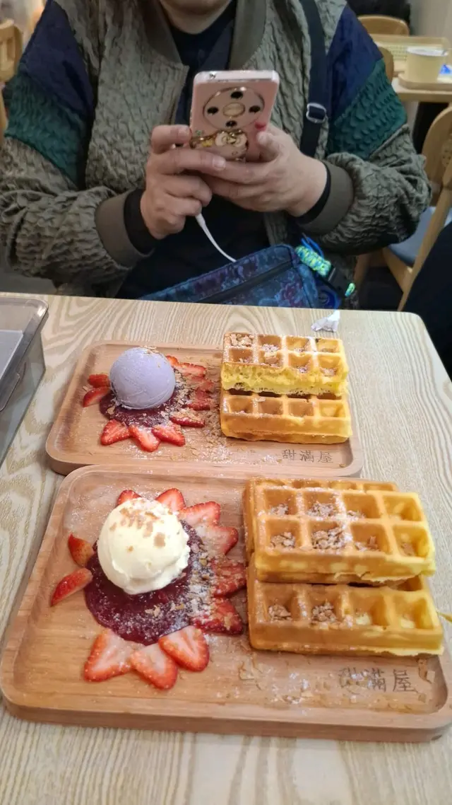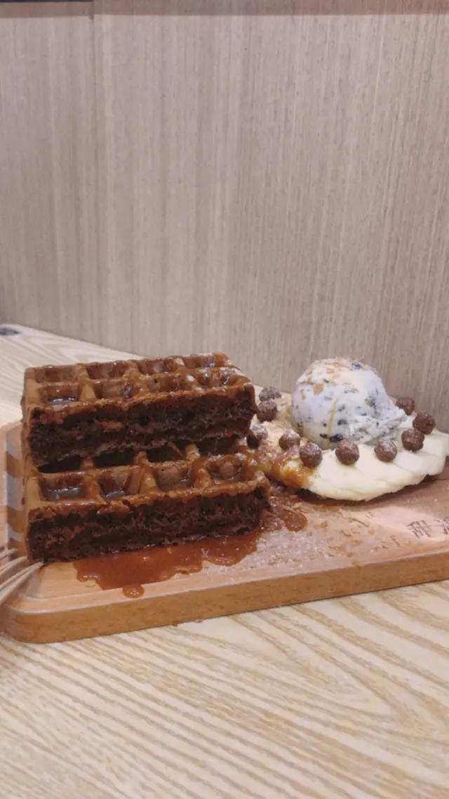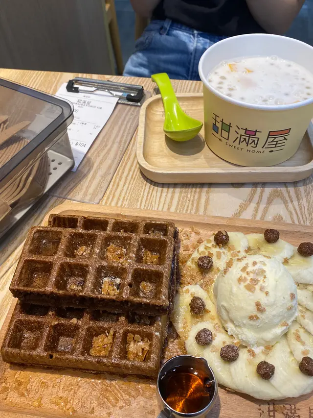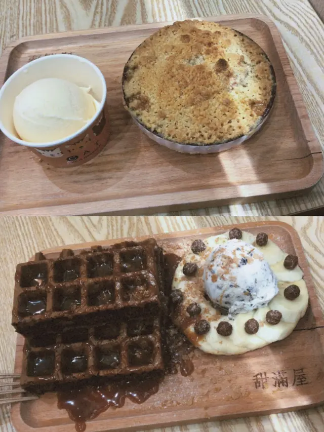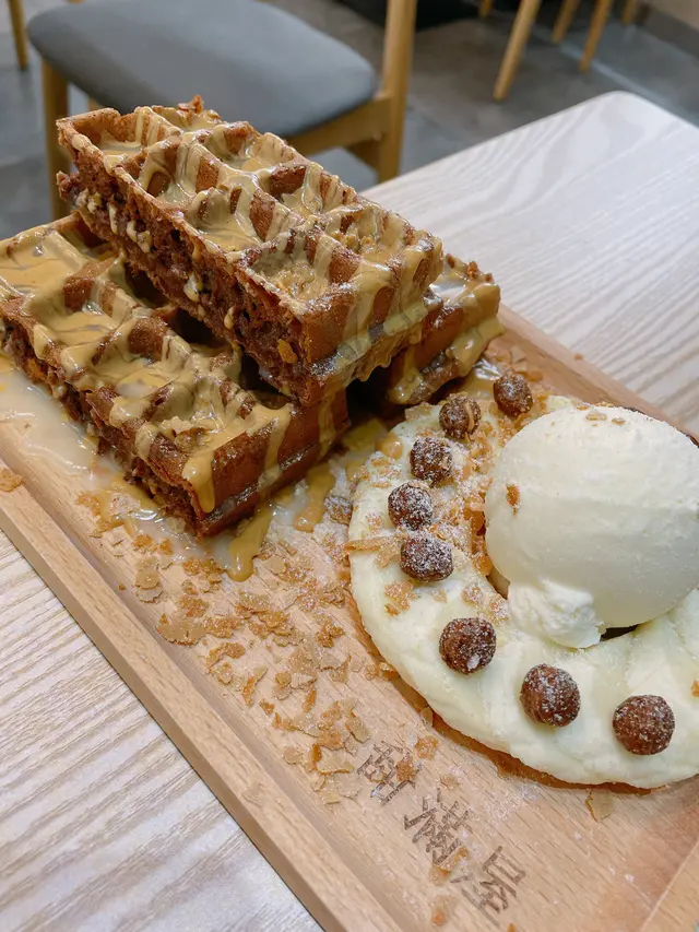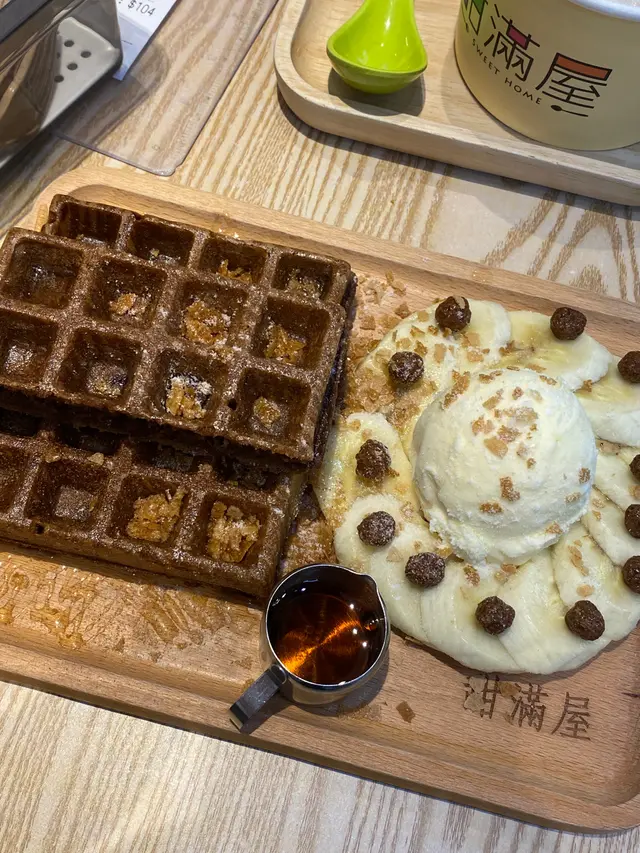 這家「甜滿屋」的窩夫真的是視覺與味覺雙重驚喜!木盤端上桌時,金黃窩夫的焦香先鑽進鼻腔,外層烤得微脆、內裡綿軟蓬鬆,咬開還帶著蛋香,撒的脆片又添了層次。