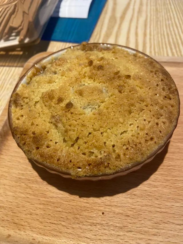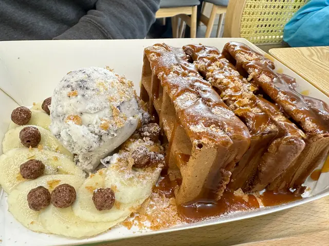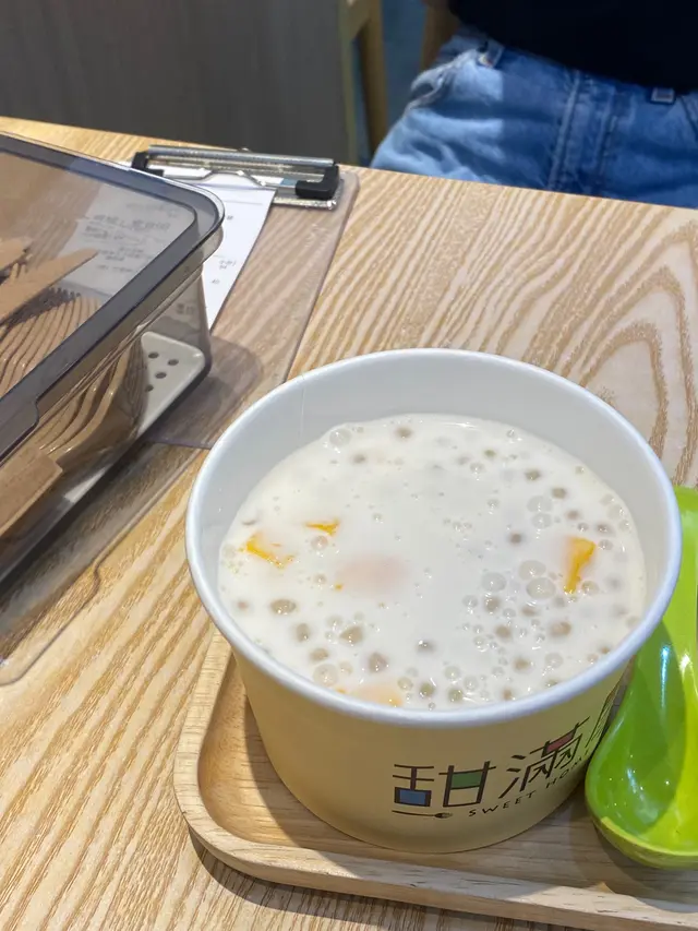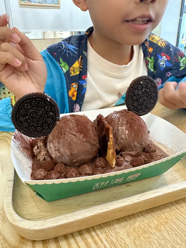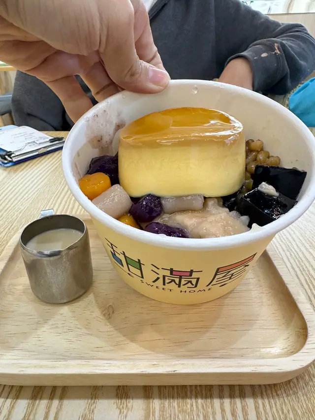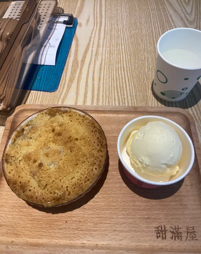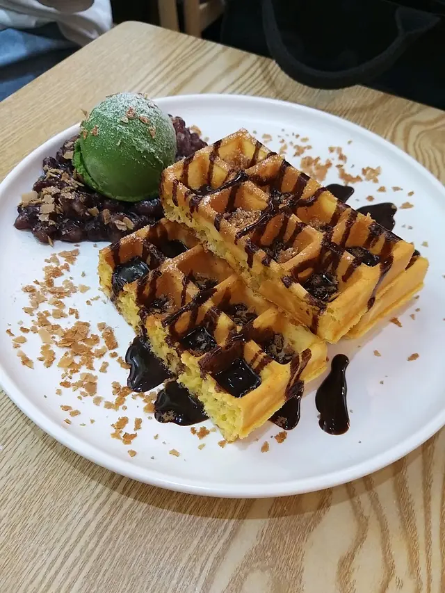 這家「甜滿屋」的窩夫真的是視覺與味覺雙重驚喜!木盤端上桌時,金黃窩夫的焦香先鑽進鼻腔,外層烤得微脆、內裡綿軟蓬鬆,咬開還帶著蛋香,撒的脆片又添了層次。
