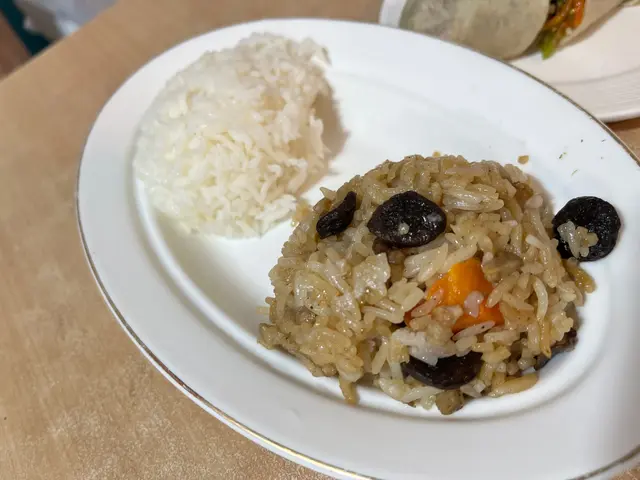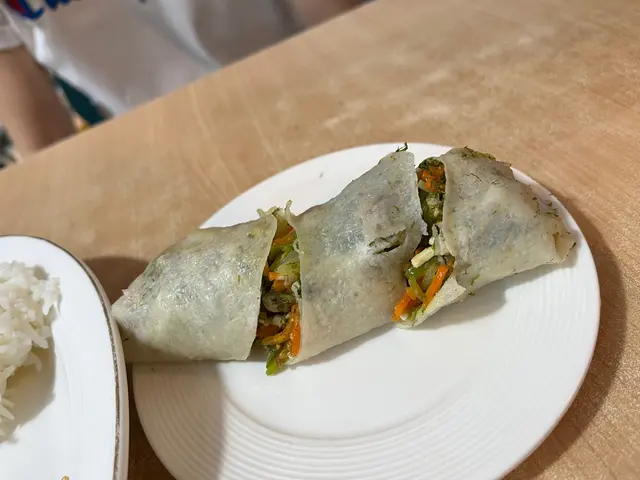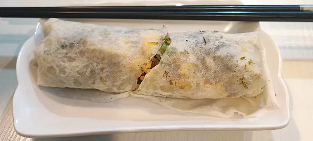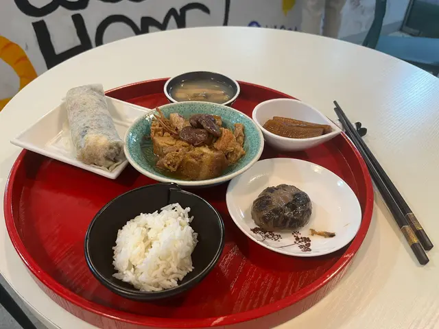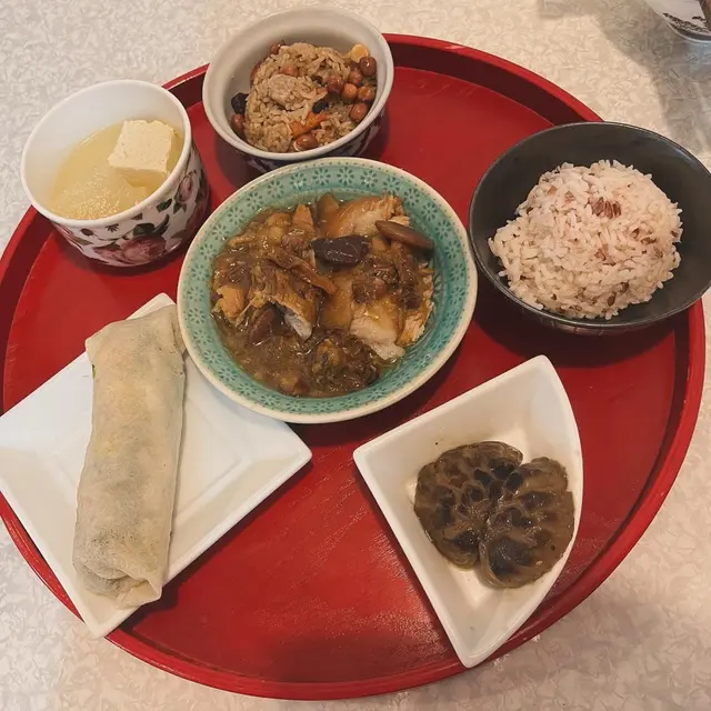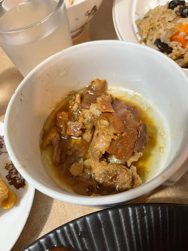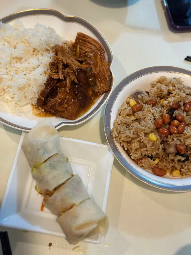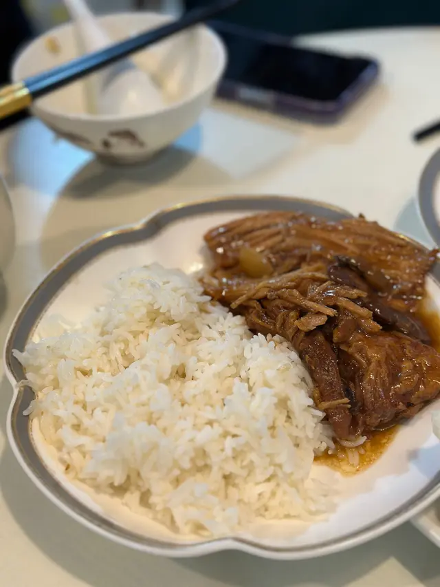 看過MM的介紹,一直想來試,終於有機會去鰂魚涌,就叫了$100的廚師發辦午餐,先來一碗封肉,隨後一碗紅米飯,一件冬菇,再來碗有花生芋頭蝦米的飯,一小碗有小件豆腐肉片清湯,我在琢磨從哪開始,最後來了潤餅卷並叫我先吃(怎麼最後才來呢:(),一口下去,鹹到不得了,撒鹽沒有揉開吧!想著喝一口湯,也是像喝濃鹽水,趕快吃了湯裡的豆腐和肉片清一下,湯裡肉片很嫩滑,可惜只一片。試吃封肉裡的豆和肉,雖是燘得夠火候,也是超鹹