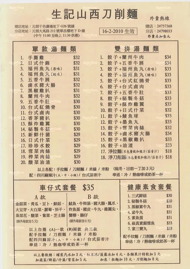 生記山西刀削麵 (元朗) 網址: https://s.openrice.com/QrbS0npm000 地址: 香港元朗大馬路212號華昌樓地下D號舖 電話: +852 24798033