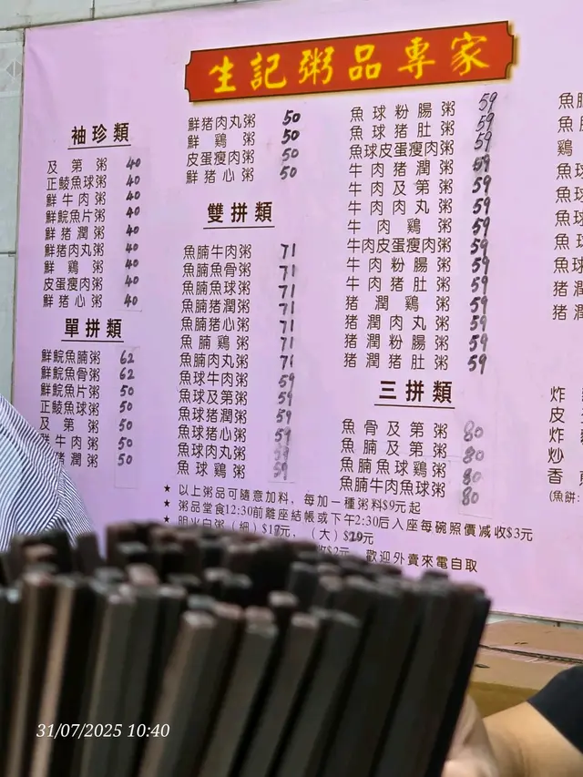 生記粥品專家 (上環) 網址: https://s.openrice.com/QrbS0pmi000 地址: 香港上環畢街7-9號地舖 電話: +852 25411099