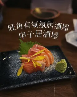 ,今晚就唙同佢嚟到旺角嘅「申子居酒屋」食吓日本嘢,講吓近況,講吓將來 !望門口真喺唔覺,原來餐廳分兩層,下層喺廚房同一列吧位,方便獨行俠或兩三知己,環境唔錯,對比上層就比較光猛。而拾級而上,上到二樓就別有洞天,環境幽暗得嚟,又打咗射燈,加深色木系枱椅,好一派居酒屋格局,蠻有深夜食堂嘅氣氛