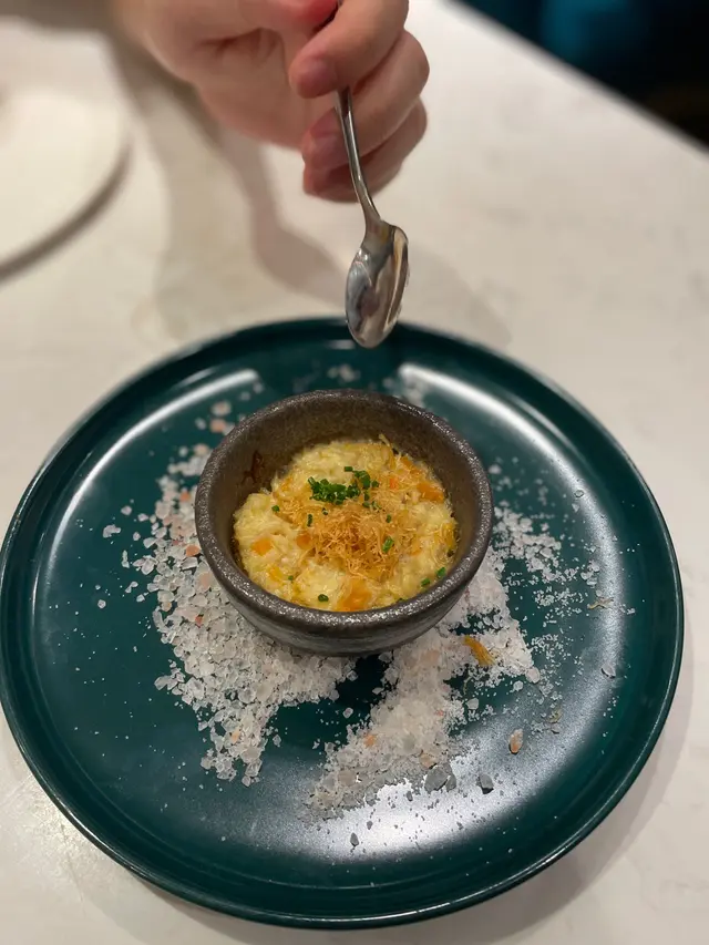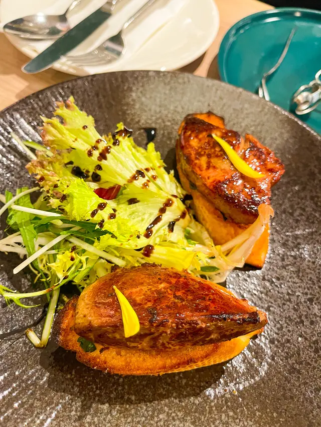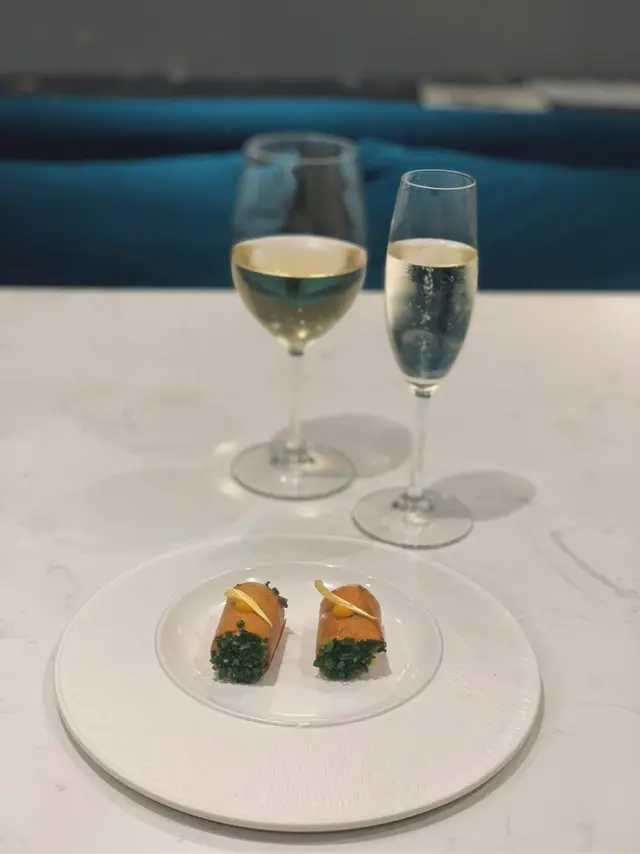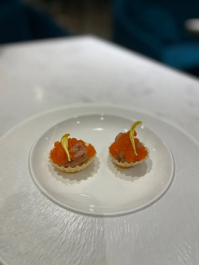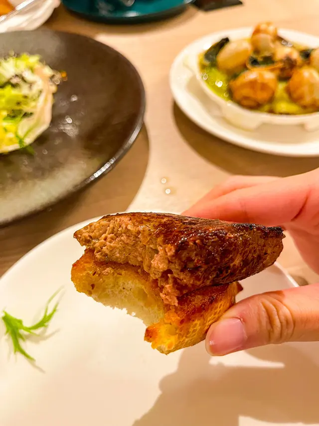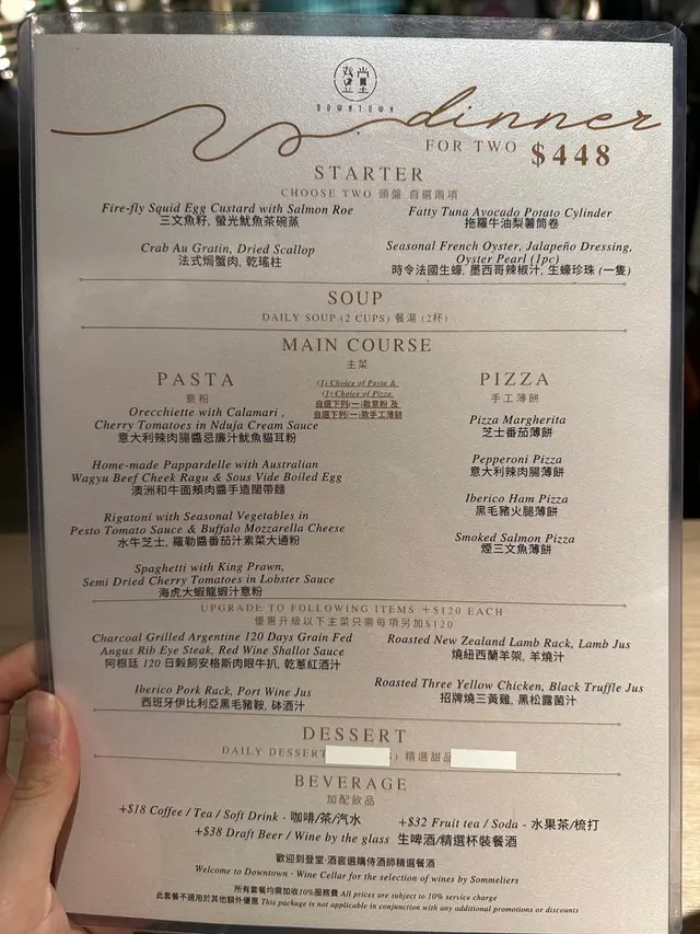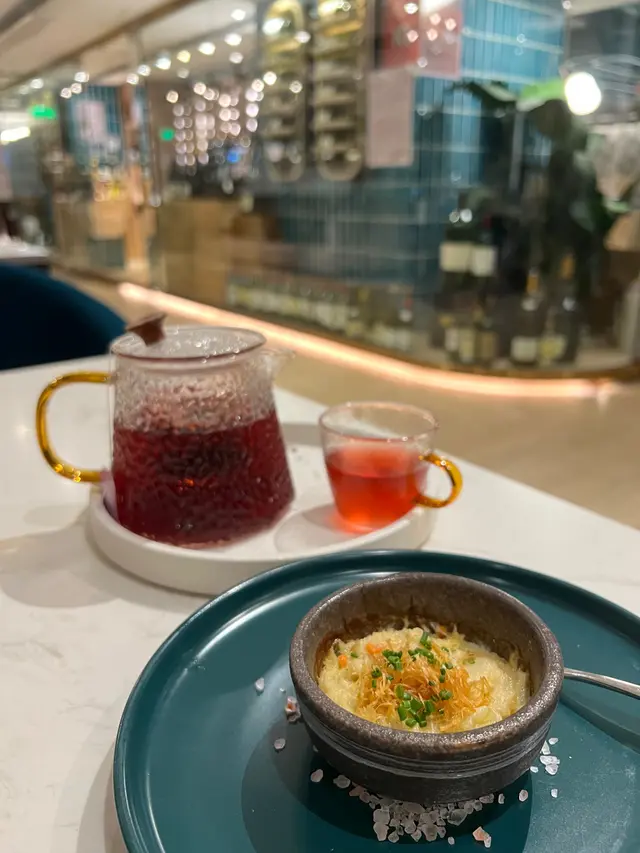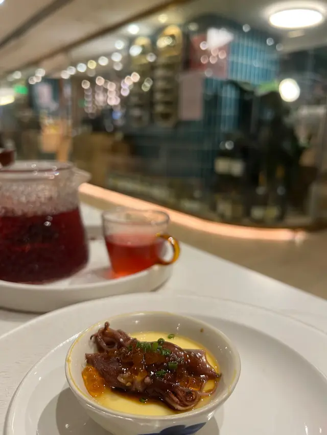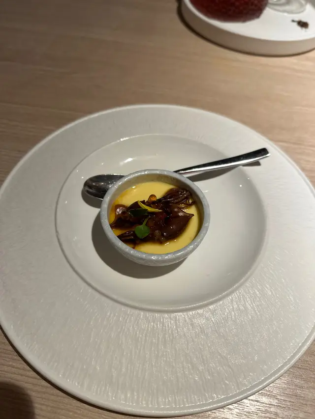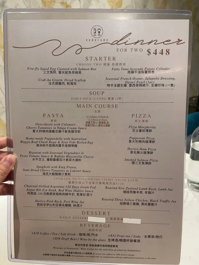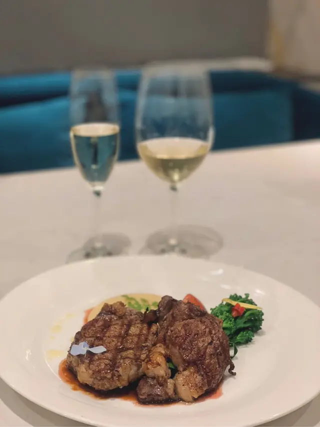 我哋叫咗二人餐前菜可以揀兩款~Fire-fly Squid Egg Custard with Salmon Roe三文魚籽,螢光魷魚茶碗蒸螢光魷魚同茶碗蒸估唔到又幾夾,帶起咗個鮮味Seasonal French Oyster, Jalapeño Dressing.法式焗蟹肉,乾瑤柱焗蟹肉上面鋪咗幾多乾瑤柱下,都幾好食Spaghetti with King Prawn,Semi Dried Cherry Tomatoes in Lobster Sauce海虎大蝦龍蝦汁意粉虎蝦都幾新鮮,食落幾鮮甜,意粉al denta 唔會太淋,蒜香龍蝦汁都算濃,幾夠味,唔錯~Charcoal Grilled Argentine 120 Days Grain FedAngus Rib Eye Steak, Red Wine Shallot Sauce阿根廷 120 日穀飼安格斯肉眼牛扒,乾蔥紅酒汁我地叫咗五成熟,不過有少少偏熟~但好彩唔會太韌,牛味都算濃,唔點紅酒汁都夠味~甜品係楊芝甘露~呢個就麻麻地了🙈小丸子好硬好有粉感同埋太甜了…查看更多