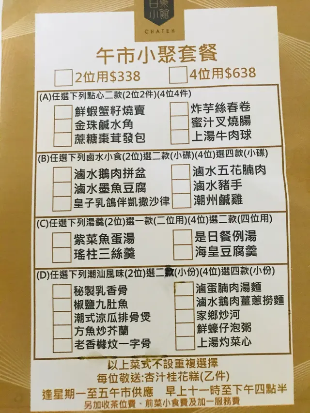 臨近新年期間,當然要外出吃頓好料,便帶同母親到酒樓吃飯,畢竟菜式比較適合長輩,我便聽取了朋友的意見,最終選擇了好友推介的尖沙咀區百樂小館餐廳。光顧當天餐廳正在推廣迎新春套餐優惠,從原價每位 $868,減至優惠價每位 $588,並且共包含有八款菜餚,以眾多款美食來說,價格可算是十分划算經濟。功夫茶吃潮州菜當然少不了配搭上一杯功夫茶,於入座後職員便先為我們奉上兩杯鐵觀音,入口味道茶香濃郁,甘甜清香,尾韻持久且有着微微苦澀回甘,很是適合用作解膩解渴。紅燒潮州中鮑翅中鮑翅份量充足,入口黏度適中,濃郁鮮甜,甚有膠質,魚翅條條分明,柔韌爽彈,真材實料,加入潮州翅必配的醋和芫荽,能提升其鮮味之餘亦能令味道更為清新。金沙發財卷拼龍鬚好市金沙發財卷就是把鹹蛋黃炸漿包裹上髮菜再進行炸製,外層色澤金黃的鹹蛋黃份量眾多,口感香脆爽酥,鹹香惹味,蛋黃味道濃郁,內餡的髮菜軟嫩柔滑,清香彈牙。龍鬚好市分開三層用料,外層多重的幼絲香口爽脆,中層用上蝦膠製作,味道鮮甜彈牙,內餡再配搭濃郁鮮嫩的蠔豉,多重口感配搭令層次十足,沾上甜醬同食更別有一番風味。旁邊的伴碟放置有數顆合桃,而且均以糖膠包裹並灑上白芝麻點綴,口感香甜酥脆,合桃味道濃烈。六頭鮑魚罐鵝掌茨汁鹹香鮮美,富有鮑魚鮮香氣味。鮑魚味道濃郁,煙韌彈牙,而內餡則製作成溏心狀態,口感帶點黏牙。鵝掌炆得軟腍,不論男女老幼皆能輕易咀嚼,入口柔軟香嫩,鮮味十足,兩款用料均盡吸醬汁,新鮮入味。伴碟的西蘭花亦香脆清甜,嫩滑爽口。蘿蔔煮細黃花魚師傅把黃花魚先煎香後再煮製而成,雖然魚隻原有骨刺較多,但絲毫不影響其可口程度,魚肉新鮮嫩滑,味道濃厚且鮮味突出,並有股獨特的魚香,配上湯底的鹹香,更增添滋味。金華竹笙扒雙蔬此道菜式配料豐富,用上金華火腿、竹笙、菜膽、娃娃菜、紅蘿蔔、菇菌,並加上茨汁。茨汁清香鮮味,金華火腿鹹中帶甜,香而不膩,竹笙香嫩彈牙,菜膽和娃娃菜軟腍嫩口,清爽鮮甜,紅蘿蔔片清甜爽脆,菇菌則潤滑細嫩,整體食材皆新鮮入味,而且清淡的味道亦可達到清味蕾之效果。鳳凰煎年糕鳳凰亦即是雞蛋,師傅把雞蛋攪拌開後再把年糕沾上蛋漿,然後進行煎製步驟,為求使其口感更為結實。年糕甜香軟糯,柔韌味濃,假若可製得再結實少許則更為可口。福果薑薯湯圓糖水的薑汁味道恰到好處,飲用時不會過於濃烈,於盛起的配料中亦能看見片狀的薑塊,可見用料十足。而福果就是白果,煲製後口感軟綿甘甜,味道帶有微微苦澀,具有益肺清熱等功效。糖水中的湯圓是自家製產品,外皮製得煙韌柔軟,富有口感,內餡的黑芝麻甘甜濃郁,香味醇正。合時生果水果是鮮橙子,師傅使用橙皮盛載並貼心地把其切粒,因而食用時可更方便。橙子可嚐出新鮮多汁,味道酸酸甜甜,清爽濃郁,用作飯後解膩消化很是適合。總結而言,餐廳裝潢高雅大氣,環境寬闊舒適,整潔衛生,菜餚真材實料,製作用心出色,食材入味可口,套餐價錢經濟合理,划算同時亦能品嚐多款美食,是與家人朋友們選擇酒樓吃飯聚餐的好地方。…查看更多