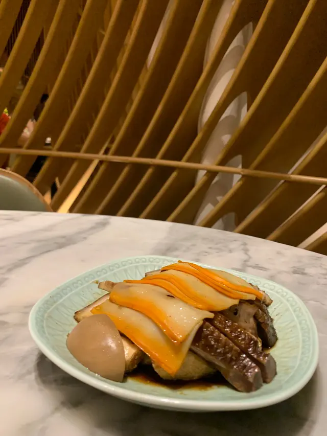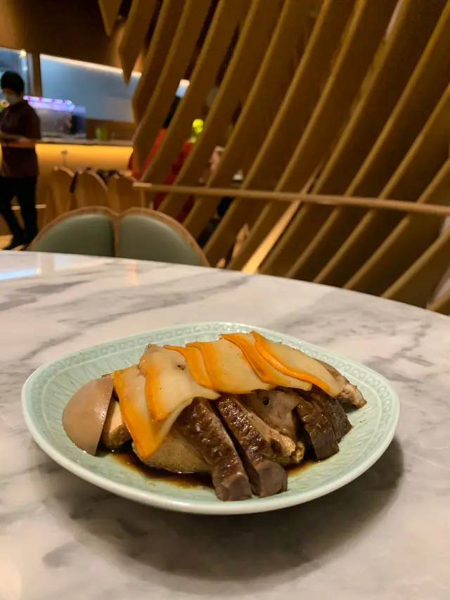 臨近新年期間,當然要外出吃頓好料,便帶同母親到酒樓吃飯,畢竟菜式比較適合長輩,我便聽取了朋友的意見,最終選擇了好友推介的尖沙咀區百樂小館餐廳。光顧當天餐廳正在推廣迎新春套餐優惠,從原價每位 $868,減至優惠價每位 $588,並且共包含有八款菜餚,以眾多款美食來說,價格可算是十分划算經濟。功夫茶吃潮州菜當然少不了配搭上一杯功夫茶,於入座後職員便先為我們奉上兩杯鐵觀音,入口味道茶香濃郁,甘甜清香,尾韻持久且有着微微苦澀回甘,很是適合用作解膩解渴。紅燒潮州中鮑翅中鮑翅份量充足,入口黏度適中,濃郁鮮甜,甚有膠質,魚翅條條分明,柔韌爽彈,真材實料,加入潮州翅必配的醋和芫荽,能提升其鮮味之餘亦能令味道更為清新。金沙發財卷拼龍鬚好市金沙發財卷就是把鹹蛋黃炸漿包裹上髮菜再進行炸製,外層色澤金黃的鹹蛋黃份量眾多,口感香脆爽酥,鹹香惹味,蛋黃味道濃郁,內餡的髮菜軟嫩柔滑,清香彈牙。龍鬚好市分開三層用料,外層多重的幼絲香口爽脆,中層用上蝦膠製作,味道鮮甜彈牙,內餡再配搭濃郁鮮嫩的蠔豉,多重口感配搭令層次十足,沾上甜醬同食更別有一番風味。旁邊的伴碟放置有數顆合桃,而且均以糖膠包裹並灑上白芝麻點綴,口感香甜酥脆,合桃味道濃烈。六頭鮑魚罐鵝掌茨汁鹹香鮮美,富有鮑魚鮮香氣味。鮑魚味道濃郁,煙韌彈牙,而內餡則製作成溏心狀態,口感帶點黏牙。鵝掌炆得軟腍,不論男女老幼皆能輕易咀嚼,入口柔軟香嫩,鮮味十足,兩款用料均盡吸醬汁,新鮮入味。伴碟的西蘭花亦香脆清甜,嫩滑爽口。蘿蔔煮細黃花魚師傅把黃花魚先煎香後再煮製而成,雖然魚隻原有骨刺較多,但絲毫不影響其可口程度,魚肉新鮮嫩滑,味道濃厚且鮮味突出,並有股獨特的魚香,配上湯底的鹹香,更增添滋味。金華竹笙扒雙蔬此道菜式配料豐富,用上金華火腿、竹笙、菜膽、娃娃菜、紅蘿蔔、菇菌,並加上茨汁。茨汁清香鮮味,金華火腿鹹中帶甜,香而不膩,竹笙香嫩彈牙,菜膽和娃娃菜軟腍嫩口,清爽鮮甜,紅蘿蔔片清甜爽脆,菇菌則潤滑細嫩,整體食材皆新鮮入味,而且清淡的味道亦可達到清味蕾之效果。鳳凰煎年糕鳳凰亦即是雞蛋,師傅把雞蛋攪拌開後再把年糕沾上蛋漿,然後進行煎製步驟,為求使其口感更為結實。年糕甜香軟糯,柔韌味濃,假若可製得再結實少許則更為可口。福果薑薯湯圓糖水的薑汁味道恰到好處,飲用時不會過於濃烈,於盛起的配料中亦能看見片狀的薑塊,可見用料十足。而福果就是白果,煲製後口感軟綿甘甜,味道帶有微微苦澀,具有益肺清熱等功效。糖水中的湯圓是自家製產品,外皮製得煙韌柔軟,富有口感,內餡的黑芝麻甘甜濃郁,香味醇正。合時生果水果是鮮橙子,師傅使用橙皮盛載並貼心地把其切粒,因而食用時可更方便。橙子可嚐出新鮮多汁,味道酸酸甜甜,清爽濃郁,用作飯後解膩消化很是適合。總結而言,餐廳裝潢高雅大氣,環境寬闊舒適,整潔衛生,菜餚真材實料,製作用心出色,食材入味可口,套餐價錢經濟合理,划算同時亦能品嚐多款美食,是與家人朋友們選擇酒樓吃飯聚餐的好地方。…查看更多