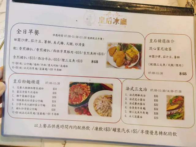 位於長沙灣既皇后冰廳,成日見人推介All day breakfast,終於試到啦!真係抵食,CP值高All day breakfast 併雞扒 $48呢個價錢真係好抵食,雞扒都好大塊,凍飲加$3加$6 就有個甘大個既菠蘿包,加$9有牛角蘇,個菠蘿包新鮮大個又好食美中不足係佢既海鹽蕉糖咖啡,特色咖啡係得熱飲無凍飲,所以最終都係飲普通咖啡佢仲可以選擇豬扒,牛扒就加$10,啲扒都大塊好食,唯一唔掂係部冷氣,係甘熱既天氣,揸完電單車拎住頭盔又熱,入到去無冷氣真係有啲辛苦!都幾好生意,多人食,如果到lunch time 要等位!呢間餐廳會令我返轉頭再食既一間餐廳!…查看更多