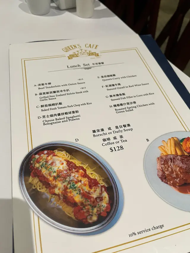 第一間去既係九龍塘又一城既皇后飯店皇后飯店都算係間連鎖餐廳1952年創立超過70年歷史好似仲黃黃地而呢間九龍塘店就98年開業但就唔係話全線結業執左之後會係黃竹坑開番我地係結業前一個月去既星期日兩點幾去到都排左半個零鐘先入到去始終都係商場餐廳門面係比較靚仔既入面仲有吊燈裝潢叫做舊而不殘即係座位黎講算係咁就算係後武肺年代兩個人都可以坐四人檯眼見格離檯一個人都可以坐四人檯而出面仲有好多人等緊不過應該就執所以用左紙檯布一野拎走就掉得因為已經過左三點所以係有下午茶餐不過我地一心想試下個豉油西餐所以都係揀番lunch set網上睇過星期六日係貴d既平日128假日150其實都真係算比較貴而且餐廳背景話係俄國菜餐廳唔知係結業前定因為午餐時間就睇唔到有咩俄式味道真係好豉油西餐既餐牌而佢menu係有餐廳介紹既set menu有跟餐湯就係最普通既紅白二湯牛油麵包係好傳統既茶餐廳味道都唔知幾多年無食過未飲完個湯就有野食先上既竟然係焗豬扒飯面頭都有幾件蕃茄size同一般快餐店差唔多但豬扒既份量少帶骨有切好個問題都係大家都唔鍾意既三色豆同埋上檯果時個兜都只係暖身焗既時間完全唔夠感覺樣樣都差少少的確係有種快餐店仲好過佢既感覺而連加一既價錢更加係快餐店既三倍牛肩扒就要再加25蚊仲貴過一般既渣渣聲鐵板餐叫做有兩大塊但成塊扒又係鬆到hihi食落口味同我公司個狗飯堂差唔多仲好意思問幾多成熟餐茶凍飲唔洗加錢咁其實係預左普通質素既但無諗到呢間餐廳可以做到同一般茶餐廳無分別姐兩個lunch set連加一都三百中係坐得舒服lor侍應都似係炒散做到散場果隻檯布又係換過張紙就得真係好有臨結業賺多一水既感覺…查看更多