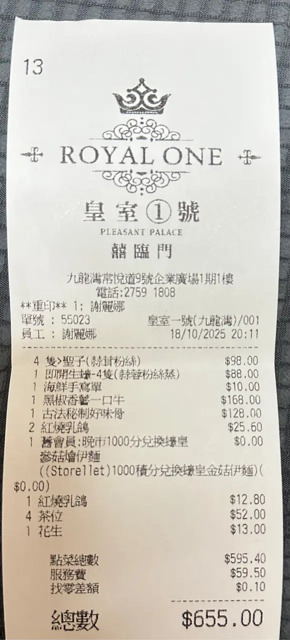 之前來過這間酒樓晚飯,感覺不錯,今日有朋友來香港,所以刻意約朋友來這裏吃飯。星期六晚上,客人不是太多。紅燒乳鴿 $12.80/隻如果星期一至四,就是$9.8/隻紅燒乳鴿都抵食,但味道偏鹹。黑椒香薯一口牛 $168牛肉好韌,薯仔普通, $168一碟份量不大,質素麻麻。古法秘制好味骨 $128薯仔欖角骨,味道偏甜,有欖角的香味,味道唔錯。4 隻>聖子(蒜蓉粉絲) $98金蒜粉絲味道非常濃郁,聖子也新鮮,但其中兩隻有沙。即開生蠔-4隻(蒜蓉粉絲蒸)$98生蠔非常大隻,很嫩滑,但蠔味欠奉。四個人埋單,$655。食物質素可以,但服務質素真的麻麻,香港飲食業人手少已經是常態,所以樓面服務生忙碌可以理解。自己走去收銀處埋單,由於服務生沒有給我們開卡,所以走到收銀處直接說出枱號,但黑衣女經理不信沒有開卡給我們,不理會我們解釋,直接去枱找卡,還質疑我們,後尾才發覺自己真的沒有開卡。而且收銀姐姐態度很差,由於是會員,問有沒有儲分?她答到:「你等我做埋呢單先得唔得呀?」雖然唔需要你非常之有禮貌,但對他這樣的回答方式感覺非常不快,感覺是客人妨礙了她。而且最後還沒有答有沒有儲分,只是簽卡後直接把單和簽卡紙放在枱上,一句「多謝」也沒有說。作為香港人,真的非常想支持香港飲食業,想着開開心心去酒樓食一餐飯,但想不到得不到基本的信任與尊重,唔會再去了。…查看更多