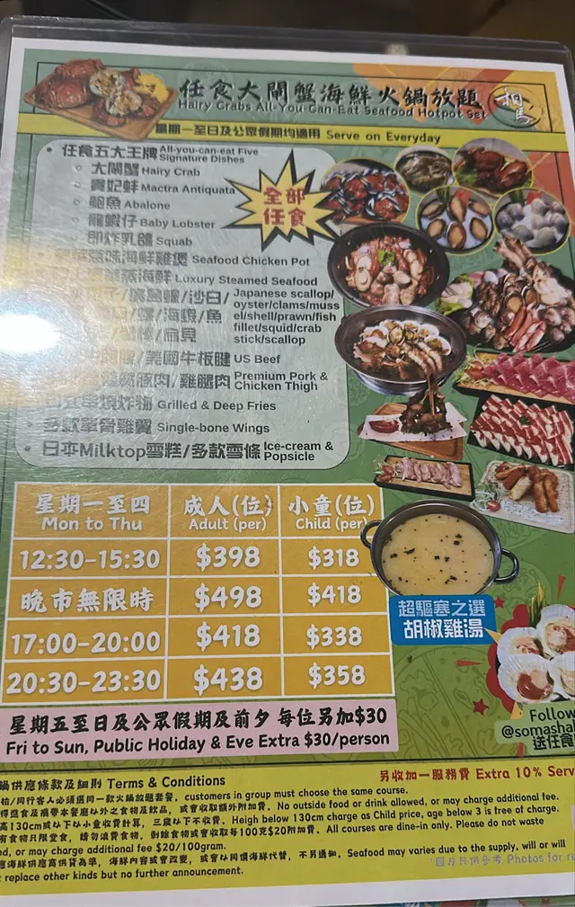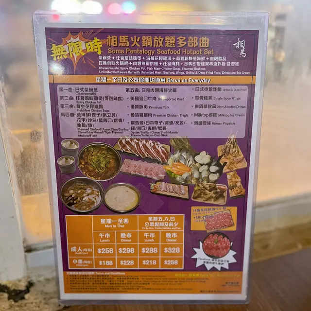 主打火鍋放題,設有多款不同的套餐選擇,並有海鮮、牛肉、串燒、炸物、飲品及雪糕可供任飲任食。