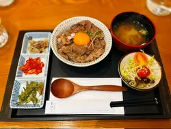 我哋都唔喺咩大食之人,所以,揀個M份量已經好夠。整份定食嘅外觀都幾靚仔,尤其碗丼飯,啲炙燒牛肉鋪到滿滿,打下成隻日本蘭王生蛋,加上一朵食用花同啲芽蔥,賣相別致。開開胃,先食啲沙律菜,襯上一橙一紅車厘茄,淋上柚子醋,簡簡單單,卻清新開胃。熱焫焫嘅味噌湯除咗麵豉味夠香之外,湯底更有少少昆布,味道幾好,食完個沙律再嚟暖和一下腸胃。日式醃菜方面,有本菇、泡菜同海帶,本菇富麻油香,泡菜酸香微辣,海帶爽脆鹹鮮,用嚟伴飯食真唔錯。而啲炙燒牛肉真喺好正,肉質本身已經好嫩滑,經過炙燒,有少少焦香之餘,逼出更出油份,感覺更富油香,拌勻隻雞蛋,沾滿蛋漿嘅牛肉就更加滑口