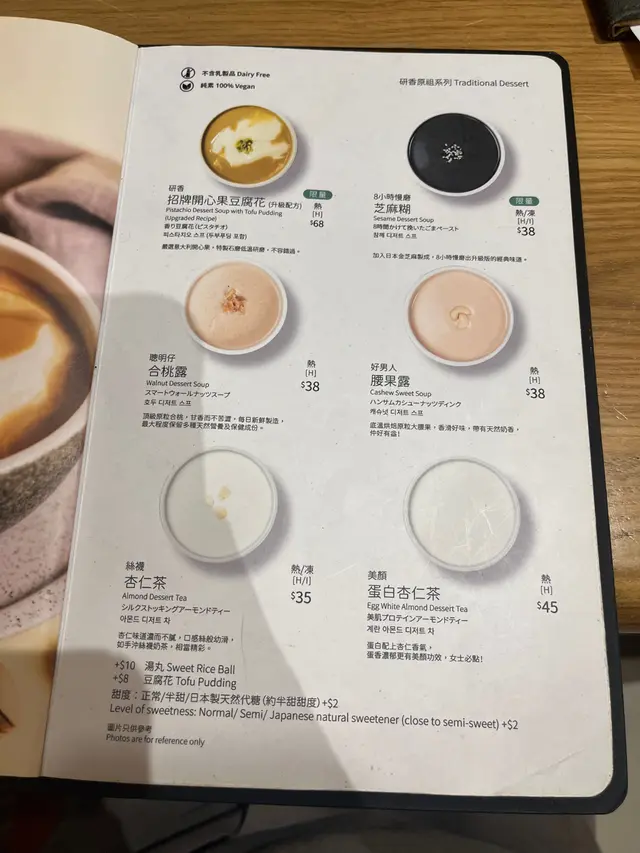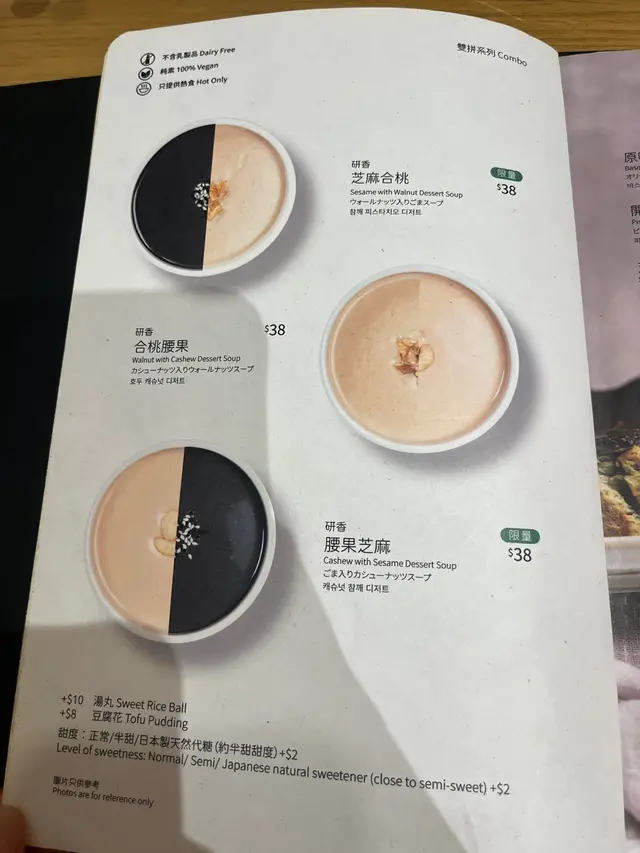 今天和閨蜜去尖沙咀逛街,行到腳累了,肚子也餓了。朋友想吃中式糖水,推薦「研香」,店內裝修很溫馨!讓人路過就想進去坐坐♥️打卡👍我們點了4款港式糖水:1️⃣ 【聰明仔合桃露】3️⃣9️⃣👉 選了半甜版,甜度剛好!合桃香味濃郁,低溫研磨,口感絲滑細膩✨2️⃣ 【芝麻合桃】4️⃣0️⃣👉芝麻+合桃的组合很搭配!香氣比純合桃露更厚重,多了一仍份芝麻香撲鼻,口感細膩綿滑密。3️⃣ 【椰皇桃膠嫩蛋白】7️⃣5️⃣👉 熱食推薦!椰皇清香扑鼻而来🥥 桃膠煮得軟糯Q彈,蛋白嫩滑,養生女孩GET✔️4️⃣ 【抹茶鮮奶豆花】4️⃣5️⃣🌟抹茶控會愛上!🍵宇治抹茶+鮮奶的搭配清新不膩,豆花入口即化,很有層次感!總結:每碗糖水都能吃出匠心研磨的功夫,來一場港味沉浸式體驗😋 📌小貼士:門口有[自助外賣]售票機,很方便!…查看更多