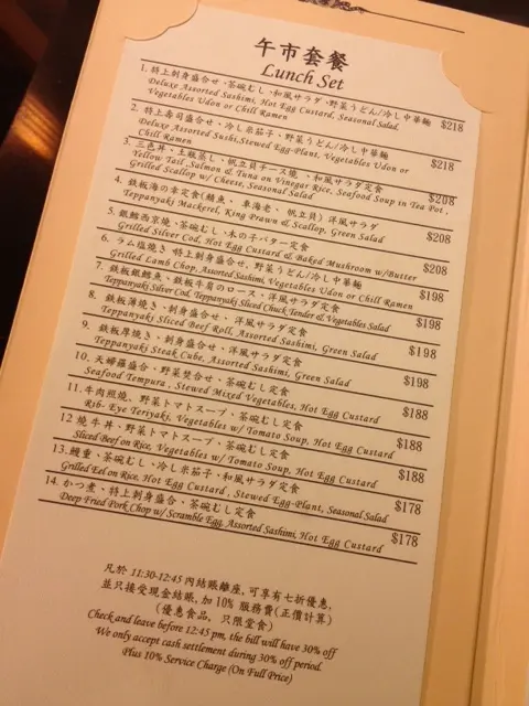 不來這裡一排, 它就已經離我們遠去了, 實在太可惜了...午餐的餐牌動輒都150-200, 中環餐廳來講都是十分貴的, 但相對而言, 質素也是上佳, 那就無話可說啦呢個特上刺身盛合, 沙律, 茶碗蒸(即係蛋), 同埋牛肉烏冬的確係超豐富刺身質素比乜乜喜屋更佳, 除左三文魚夠鮮甜味美外, 仲有埋一片海膽, 極豐富又新鮮沙律用既豆腐好靚, 味道極佳又香, 芝麻醬唔係用百佳CHEAP野, 而係真係有芝麻係度既, 而且菜葉本身好細, 水份充足, 沙律黎講都係上佳既牛肉烏冬都唔會太馬虎, 烏冬夠彈牙, 牛肉亦JUICY有肉香, 可以成日黎食LUNCH就好啦...…查看更多