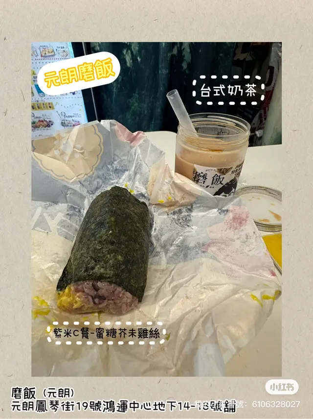 磨飯 (元朗)📍元朗鳳琴街19號鴻運中心地下14-18號舖之前係出荃灣/旺角買過一間幾好食嘅紫米飯團但要專登搭車出去食🙈 我又唔想有日聽同事講元朗有間賣紫米飯團好好食嘅😍我聽完之後又點可以唔試 😂我點咗佢地嘅餐紫米C餐-$45蜜糖芥末雞絲加芝士碎(+4蚊)配玉子將軍芝士腸加台式奶茶(+16)呢個餐就要$65味道呢講我覺得同我出去荃灣/旺角食個間鋪嘅味道差唔多飯團入面嘅雞絲唔會話多到啖啖都有 不過唔會少到食一啖就無咗個一種反而佢嘅蜜糖芥末同我加4蚊嘅芝士多到 每食一啖都知佢地嘅存在😂台式奶茶茶味好出 佢嘅珍珠唔係我地平時食開個款係邊明狀 飲極都飲唔曬d珍珠😂小食玉子將軍芝士腸 佢嘅玉子嘅嫩口玉子係會長過佢條腸1/3所以玉子同腸唔係啖啖都有如果你同我一樣唔想專登搭車出去個間專門店食個間外賣紫米飯團 可以過黎試下呢間但我個人只會話想試叫外賣啦唔好堂食🙈因為鋪位好窄好細 佢又有限時30分鐘#karlee90s #foodiehk #hkig #ighk #hkfoodie #foodieblogger #元朗 #元朗美食 #元朗小店 #紫米飯糰 #紫米 #台式奶茶 #鳳琴街 #鳳琴食街…查看更多
