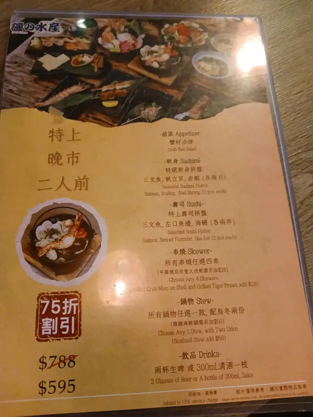 觀塘海濱向來多餐廳,今次選擇左呢間日式餐廳特上晚市二人前蟹籽沙律🥗沙律新鮮爽脆,撈上粒粒蟹籽食,有漲爆口感,作為開胃菜一流特選刺身拼盤三文魚:肉質細嫩肥美赤海蝦:蝦肉肉質彈牙,蝦頭仲有甘甜的蝦膏味帶子:肉質肥厚,富有彈性,味道鮮甜特上壽司拼盤個人認為最中意海鰻sushi,肉質細緻鮮甜而且米🍚飯粒粒分明鹽燒白鱔白鱔燒得好脆皮,魚肉肉質彈牙~鹽燒五花腩五花腩juicy,咬落去有爆汁效果免治雞肉軟骨棒將蛋黃拌勻,再蘸上免治雞肉🍗棒一起吃口感更軟滑creamy,非常夾~焦糖菠蘿燒成微微的焦香,吃下去很juicy香甜極上牛小排鍋牛小排吃下去很嫩,肉🥩味濃郁~鍋底仲放上豆腐、娃娃菜等配菜中和一下口腔的肥膩感烏冬每條烏冬都好彈牙,吃下去好順滑,尤其暖胃300ml Sake女城王sake,帶有果香,平衡了辛口的風味,使口感更顯豐富。…查看更多