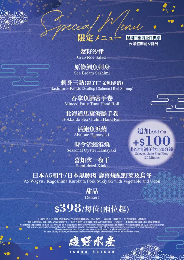 磯野水產 (銅鑼灣) 網上訂座享低至5折優惠兼賺Rice Dollars 網址: https://s.openrice.com/QrbS0cnu800 地址: 香港銅鑼灣軒尼詩道525號澳門逸園中心19樓 電話: +852 27663678