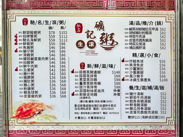 礦記生滾粥 (太子) 網址: https://s.openrice.com/QrbS0v1u700 地址: 香港太子塘尾道209號榮基樓地下B號舖 電話: +852 36752615