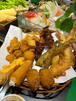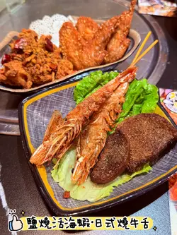 🍲 避雨好去處:本來諗住食普通放題,點知呢間有火鍋+刺身+燒烤,仲可以有好多湯底揀~酸菜魚湯底,魚片夠滑,湯底夠味,唔使加錢轉款,幾抵! 🍣 刺身選擇多: - 上枱時噴晒煙咁效果,幾有氣氛。三文魚、螺片、赤蝦都好新鮮,蝦都有三款,仲有海膽軍艦,細細見唔會太飽味道唔錯。 - 麻辣小龍蝦幾入味,辣度適中,食得過癮。 🦪 火鍋海鮮質素幾OK: - 海鮮拼盤有蠔、松葉蟹腳、鮑魚,蠔夠飽滿,蟹腳算鮮甜,整體合格。 - 雪櫃仲有大量火鍋配料:牛肉、丸類、蔬菜,款式算多,唔會揀唔落手。 🍢 燒烤幾好食: - **燒菠蘿**係放題必食!表面微焦,咬落多汁,解膩一流。 - 牛舌、蝦同鱔件燒得剛好,調味適中,又唔會太乾。 🍨 甜品飲品任揀: - 飲品有汽水、茶、果汁,選擇夠晒多。 - 甜品有布甸、啫喱,門口個雪櫃仲有好多款雪條、雪糕,臨走拎支朱古力雪糕食,大滿足。 💬 總結:價錢合理,食物種類多,刺身、火鍋、燒烤三樣都有,適合一班人聚餐。下次落雨或者會再嚟! 唔同時段仲有唔同優惠,鍾意食多啲嘅可以加錢,豐儉由人!📌小貼士:晚市多人,最好訂位。 …查看更多