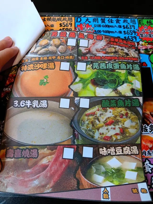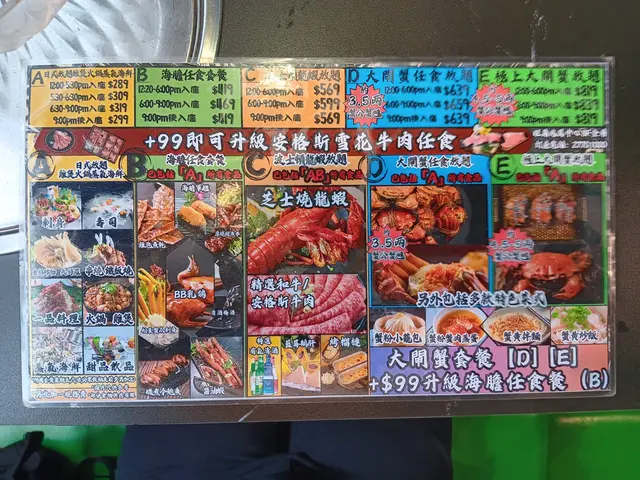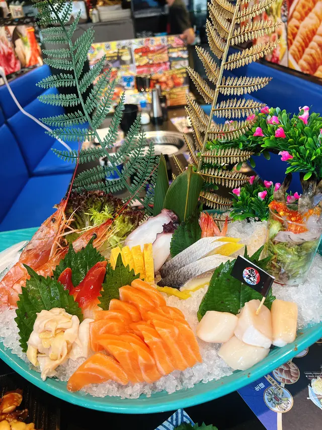 🍲 避雨好去處:本來諗住食普通放題,點知呢間有火鍋+刺身+燒烤,仲可以有好多湯底揀~酸菜魚湯底,魚片夠滑,湯底夠味,唔使加錢轉款,幾抵! 🍣 刺身選擇多: - 上枱時噴晒煙咁效果,幾有氣氛。三文魚、螺片、赤蝦都好新鮮,蝦都有三款,仲有海膽軍艦,細細見唔會太飽味道唔錯。 - 麻辣小龍蝦幾入味,辣度適中,食得過癮。 🦪 火鍋海鮮質素幾OK: - 海鮮拼盤有蠔、松葉蟹腳、鮑魚,蠔夠飽滿,蟹腳算鮮甜,整體合格。 - 雪櫃仲有大量火鍋配料:牛肉、丸類、蔬菜,款式算多,唔會揀唔落手。 🍢 燒烤幾好食: - **燒菠蘿**係放題必食!表面微焦,咬落多汁,解膩一流。 - 牛舌、蝦同鱔件燒得剛好,調味適中,又唔會太乾。 🍨 甜品飲品任揀: - 飲品有汽水、茶、果汁,選擇夠晒多。 - 甜品有布甸、啫喱,門口個雪櫃仲有好多款雪條、雪糕,臨走拎支朱古力雪糕食,大滿足。 💬 總結:價錢合理,食物種類多,刺身、火鍋、燒烤三樣都有,適合一班人聚餐。下次落雨或者會再嚟! 唔同時段仲有唔同優惠,鍾意食多啲嘅可以加錢,豐儉由人!📌小貼士:晚市多人,最好訂位。 …查看更多
