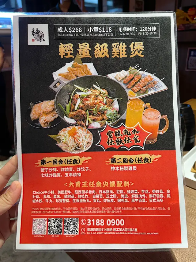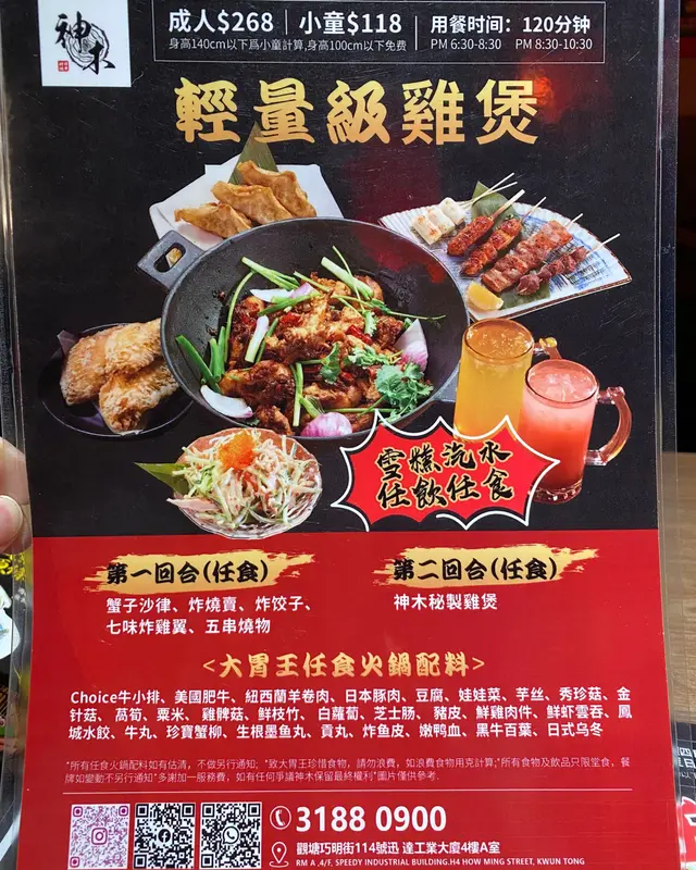同朋友慶祝生日就當然要搵啲舒服又抵食嘅餐廳,上網搵到係觀塘工廈入面有間做緊"任食日式火鍋放題 ",見介紹都唔錯,所以就鎖定嚟食返餐兼聚一聚。店內裡裝修都好精緻,好有日式居酒屋嘅風味,環境幾大坐得舒服,而且仲有室外地方添(早知就帶埋狗狗嚟陪食啦)。我地今次揀左 輕量級雞煲 ,係用餐時間120分鐘內就任食同任飲。任食方面就係以一回合咁計,即係任食完一回去下一回時就唔可以叫返上一回合嘅食物。飲品嘅種類都幾多,連啤酒都有得提供呀!先黎第一回合 就係以小食同沙律菜為主,先嚟重份量嘅清新蟹子沙律,然後就由廚師安排嘅五串燒物同炸物。炸燒賣、炸餃子、七味炸雞翼同埋五串燒物就有雞皮、雞腎、雞軟骨、蕃茄、京蔥,全部都係即刻炸/燒,所以食起嚟熱辣辣,而且味道都剛剛好,所以唔錯。前菜之後就到第二回合,即係焦點所在 神木秘製雞煲,份量比想像中足料,雞肉好嫩滑,而且佢個醬汁味道剛好,食落特別惹味。最後就加湯去到第三回合,即係任食火鍋,配料選擇都有好多,我地點左肉類方面我地點左熊本豚肉、美國肥牛同埋餃子、芝士腸、菇同菜類(其實仲有啲雲吞、水餃同牛柏業,不過就掛住食忘記左影相..哈哈)。火鍋食材質素都唔錯,入口好新鮮,所以我地都來來回回食左好多轉,食到好飽飽呀!最後就當然唔少得食返粒雪糕啦!…查看更多