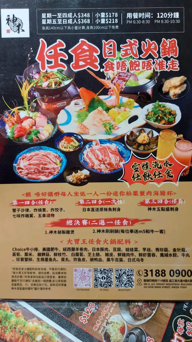 同朋友慶祝生日就當然要搵啲舒服又抵食嘅餐廳,上網搵到係觀塘工廈入面有間做緊"任食日式火鍋放題 ",見介紹都唔錯,所以就鎖定嚟食返餐兼聚一聚。店內裡裝修都好精緻,好有日式居酒屋嘅風味,環境幾大坐得舒服,而且仲有室外地方添(早知就帶埋狗狗嚟陪食啦)。我地今次揀左 輕量級雞煲 ,係用餐時間120分鐘內就任食同任飲。任食方面就係以一回合咁計,即係任食完一回去下一回時就唔可以叫返上一回合嘅食物。飲品嘅種類都幾多,連啤酒都有得提供呀!先黎第一回合 就係以小食同沙律菜為主,先嚟重份量嘅清新蟹子沙律,然後就由廚師安排嘅五串燒物同炸物。炸燒賣、炸餃子、七味炸雞翼同埋五串燒物就有雞皮、雞腎、雞軟骨、蕃茄、京蔥,全部都係即刻炸/燒,所以食起嚟熱辣辣,而且味道都剛剛好,所以唔錯。前菜之後就到第二回合,即係焦點所在 神木秘製雞煲,份量比想像中足料,雞肉好嫩滑,而且佢個醬汁味道剛好,食落特別惹味。最後就加湯去到第三回合,即係任食火鍋,配料選擇都有好多,我地點左肉類方面我地點左熊本豚肉、美國肥牛同埋餃子、芝士腸、菇同菜類(其實仲有啲雲吞、水餃同牛柏業,不過就掛住食忘記左影相..哈哈)。火鍋食材質素都唔錯,入口好新鮮,所以我地都來來回回食左好多轉,食到好飽飽呀!最後就當然唔少得食返粒雪糕啦!…查看更多
