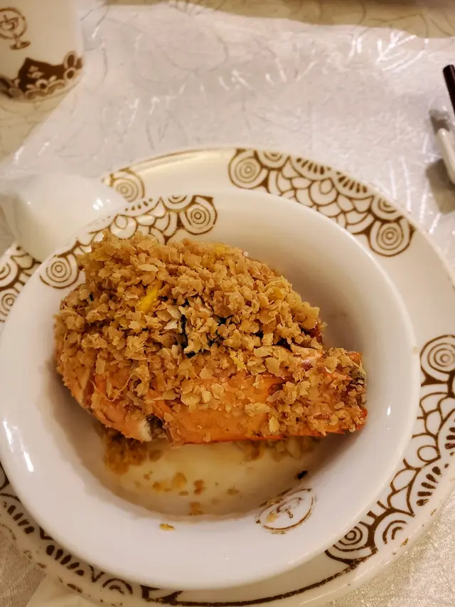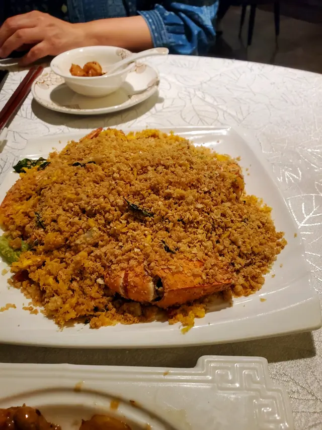 安排到附近商業大廈嘅一樓,裝修好普通頗舊,枱與枱之間嘅距離窄,好嘈。就係好屋邨酒樓嘅感覺。🤔糯米炒膏蟹似乎係呢度嘅招牌菜。但係食落比較普通,米飯食落好多飯焦,硬硬哋嘅感覺,唔係炒糯米飯嗰種香軟煙靭嘅質感。蟹本身正常水平。整體嚟講冇乜特別,唔明點解係招牌菜。