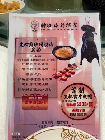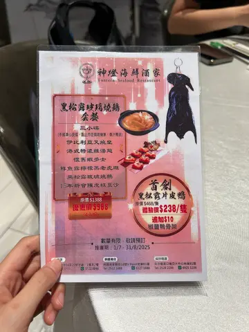 片皮鴨就食得多,黑松露版本真係第一次🤣餐廳招牌菜竟然係黑松露玻璃燒鵝🤯 估唔到又幾好食!新出嘅黑松露片皮鴨做緊接近半價優惠,我哋食嘅四人套餐,而家都做緊限時72折,幾抵食的✨❝ 黑松露玻璃燒鵝燒鵝皮脆肉嫩,黑松露幽香滲入肉質,帶來濃郁而高雅嘅層次感,令人回味無窮✨❝ 黑松露片皮鴨全港首創!用黑松露醬風乾醃製足足24個鐘,與肥美鴨肉完美融合,奢華滋味一試難忘🤤❝ 三小碟(溏心皮蛋、炸豆腐、香汁鴨舌)溏心皮蛋蛋黃溏心流動,入口絲滑濃香,將傳統小菜嘅極致演繹!炸豆腐金黃誘人,外脆內嫩,輕咬即釋放豆香,配上微鹹醬汁,簡單食材化身令人滿足嘅小食😋香汁鴨舌味道濃郁且帶甜,簡單卻充滿風味嘅經典小菜✨❝ 伊比利亞叉燒皇頂級伊比利亞黑毛豬肉製成,叉燒肥瘦均衡,入口軟嫩多汁,蜜汁香甜與肉香交織,堪稱叉燒界皇者👑❝ 港式特濃雞湯翅湯底鮮甜醇厚,翅軟滑彈牙,暖心又滋補☺️ 不過就略嫌翅嘅份量唔夠多🫶🏻❝ 懷舊蝦多士用隻手打蝦膏,炸至金黃香脆,復古風味勾起滿滿懷舊情懷,令人一試愛上😍❝ 鮮魚露檸檬蒸老虎斑老虎斑肉質細嫩,檸檬清香滲透魚身,蒸煮保留鮮甜原味,入口滑嫩,清新酸香令人胃口大開🍋❝ 15年新會陳皮紅豆沙陳皮香氣獨特,紅豆沙濃稠細滑,甜而不膩,完美收結一餐甜美體驗🍵…查看更多