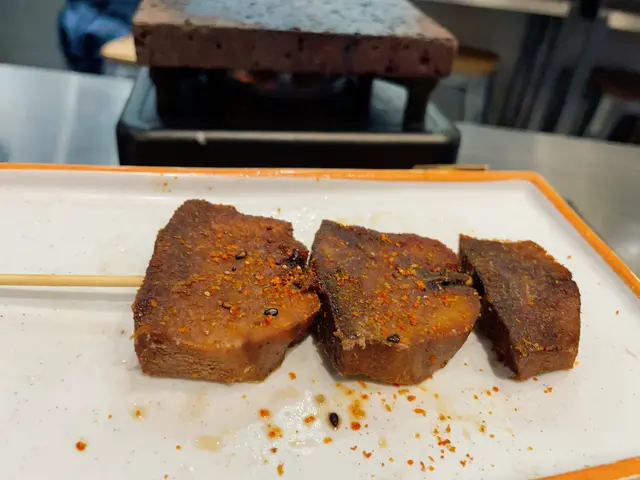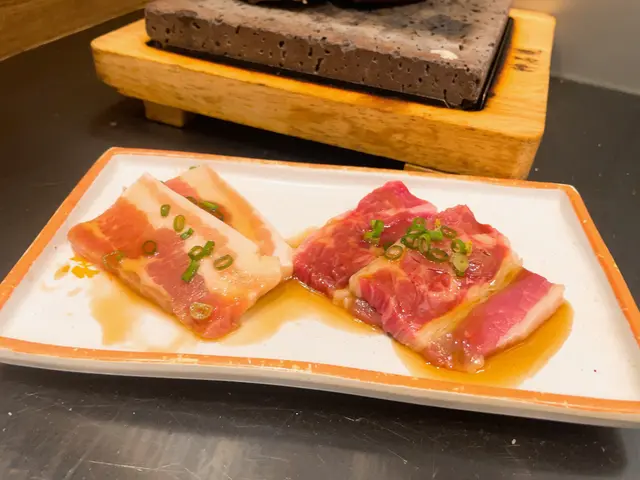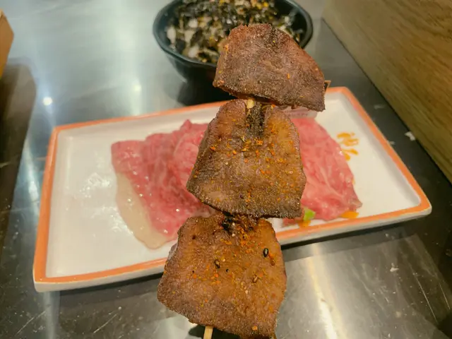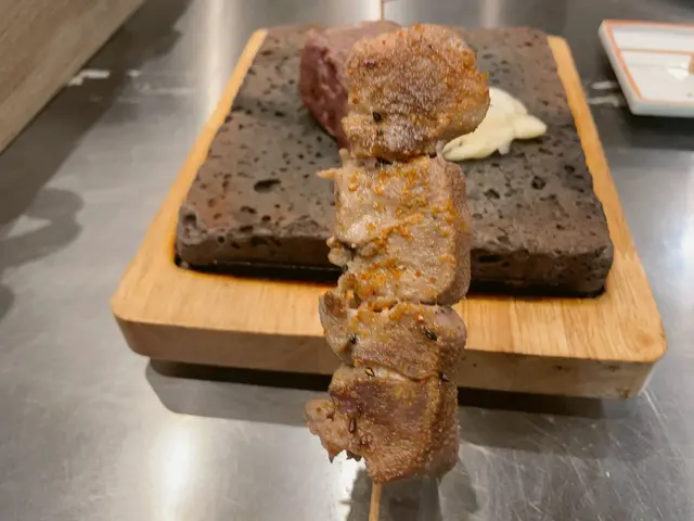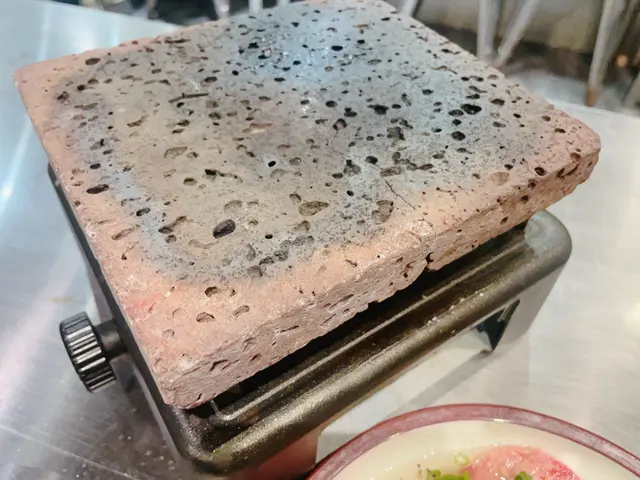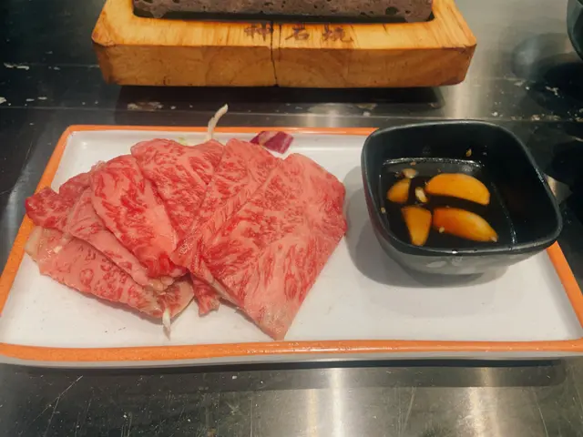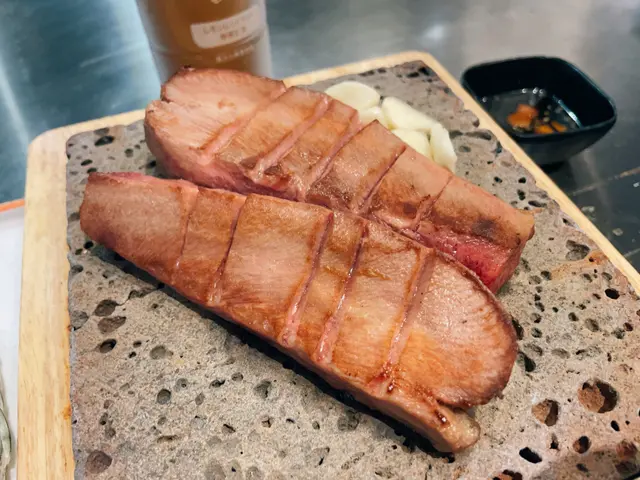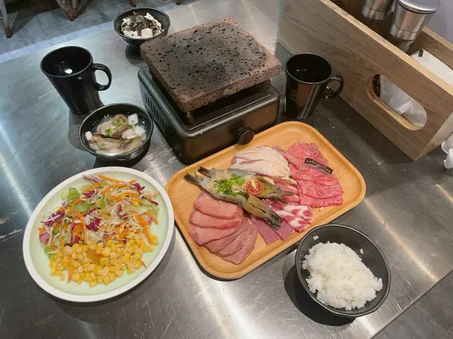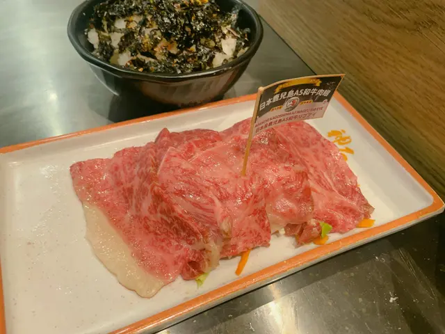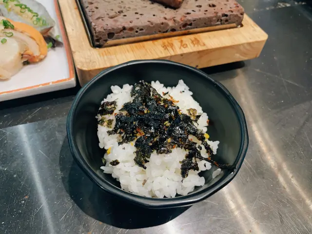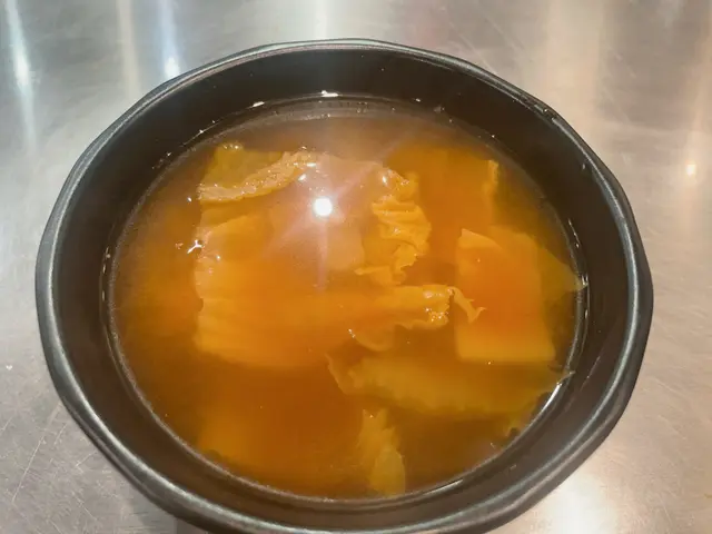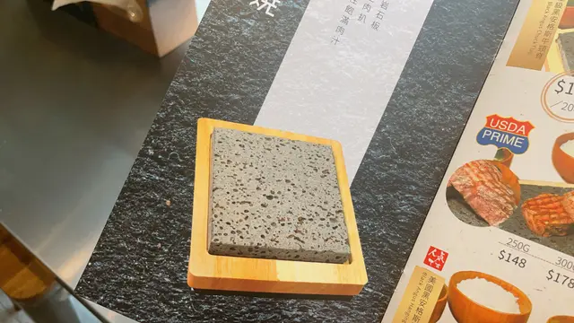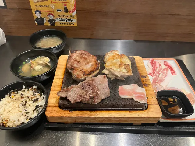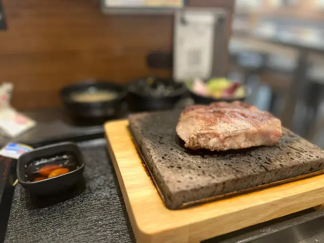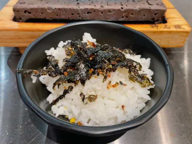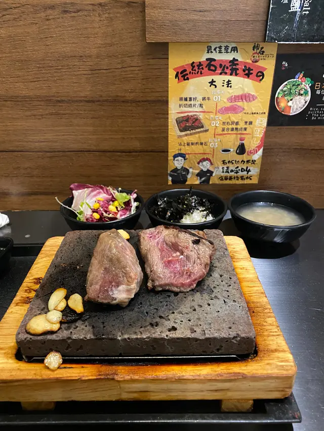 侍應哥哥送牛扒上枱嘅時候,張紙係蓋面,防止滾油彈到周圍都係,係有花心思嘅:聆聽着充滿懷舊感的日文歌,慢慢將牛扒切成細塊,都舖滿成塊石板呢。牛扒充滿肉味,香氣撲鼻。沙律清新,拌胡麻醬一流。湯內有滿滿的蘿蔔同肉,十分清甜!紫菜蓋飯,拌牛扒,食到停唔到口