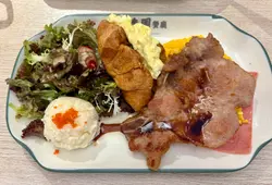 星期六下晝四點半左右黎食,已經賣晒叉燒酥,非常可惜。員工說師父已經收咗工,第二日請早。一場黎到,當然要食返個tea先走。我喺QR code落單,叫咗個$57茶餐。瑞士雞脾撈麵個雞脾好一般,冇話好入味。撈麵另外用碗仔上,熱辣辣,啲汁食落都似係瑞士汁咁上下。仲送咗幾棵沙律菜。火腿奄列好普通,個牛角包太古怪,放棄無食,個包可以加錢轉多士。檸啡呢個係靈魂,消暑、清爽!服務有個哥哥仔好勤力掃地,食食下要縮腳,地道香港style!