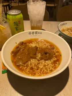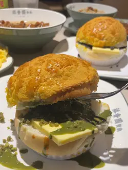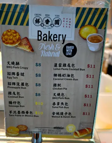 它的鎮店三寶就是:蛋撻、菠蘿油、蓮蓉雞尾包。我們慕名而來,試試它的三寶。招牌蛋撻:剛剛出爐熱乎乎的,個子厚實,入口蛋味濃郁、香滑,酥皮薄脆,真的好吃。開心果菠蘿包:將特色傳統港式風味菠蘿包加以創新,加入了開心果醬,果醬又濃又香甜,菠蘿包外皮酥脆。蓮蓉雞尾包:裡面是空心的,裝有蓮蓉餡,餡也是熱的,麵包很香,好吃,果然是一絕。除了麵包、蛋撻,祥香園還提供傳統港式料理:咖喱牛坑腩飯:是正宗的港式咖哩味,牛腩和牛筋煮得軟爛入味,米飯也好吃。全日餐:包括了香煎豬扒、火腿、炒蛋、牛角包、沙律、薯泥;淋上的醬油味道也不錯。飲料點了凍奶茶、特色飲料"黑白抹茶紅豆冰"想要試試地道港式美食,去找老店吧!
