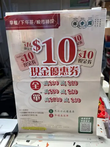 家裡收到祥香園的現金券,上面寫10月1日至10月31日,本人10月5日去吃早餐。食物方面是普通茶餐廳水準,沒有拍食物照片,留下單據供大家參考。檸檬利賓立沒有給木棍/湯匙搗檸檬片。然而本人付款時才得知優惠卷不適用於公眾假期及星期日。原來活動條款沒有印在現金券上,而是列印在另一頁面上。但本身現金券上的10月1日都是紅日,本人覺得有誤導成分,非常失望。如果現金券上面寫10月內使用,活動條款列印在現金券的正面或背面才恰當。本人在現場有提出現金券上的10月1日是公眾假期,職員沒有理會。