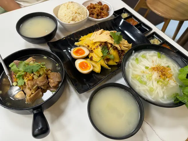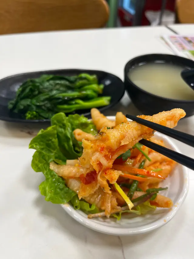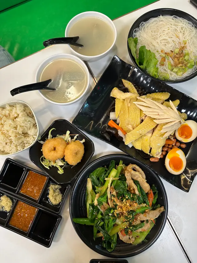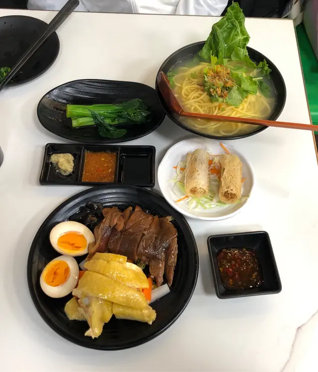 嗌左兩個「1人套餐」:海南雞拼豬仔髀飯和農家走地雞飯。❤️海南雞拼豬仔髀飯配灼青菜飯轉左油麵半價追加了小食:手工炸春卷另加了樽裝可口可樂。灼青菜🥬是菜心。菜心十分翠綠爽脆鮮嫩冇渣。送了一碗湯,湯內有冬瓜和雞腎,味道清甜無味精。海南雞拼豬仔髀一次過滿足我兩個慾望!😍 海南雞雞肉嫩滑~豬仔髀有少少肥膏,邪惡得黎好滋味~😋估唔到重有烚蛋,還有酸蘿蔔、青瓜、木耳和花生。油麵湯夠熱。麵條軟硬適中。手工炸春卷剛炸起上枱,入口香脆重熱。點埋甜酸醬食十分滋味。想試下農家走地雞同海南雞嘅分別就嗌左❤️「農家走地雞飯配灼青菜」1人套餐。揀左油飯、多飯。半價追加了小食:泰式酸辣鳳爪個人覺得農家走地雞雞味較海南雞濃,肉質冇海南雞咁滑。重有雞腎。油飯好香口,不禁食多幾啖飯😋。泰式酸辣鳳爪真係幾辣🥵,加上微甜帶辛生洋蔥🧅,是一款開胃小吃👍🏻。查看更多