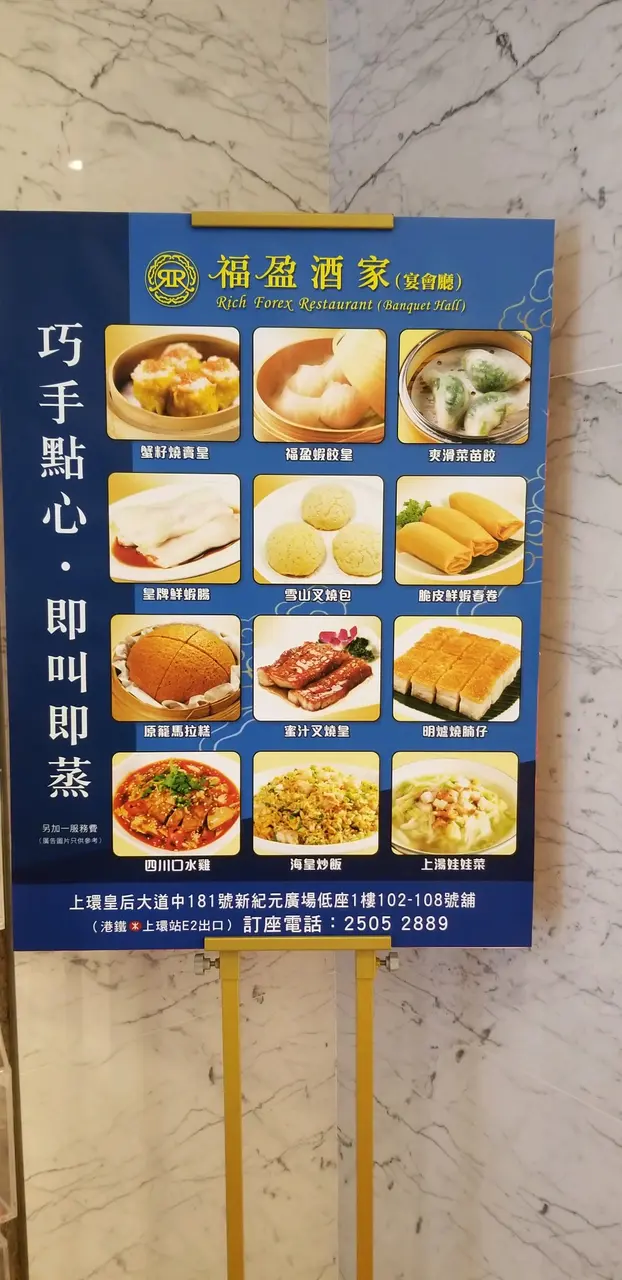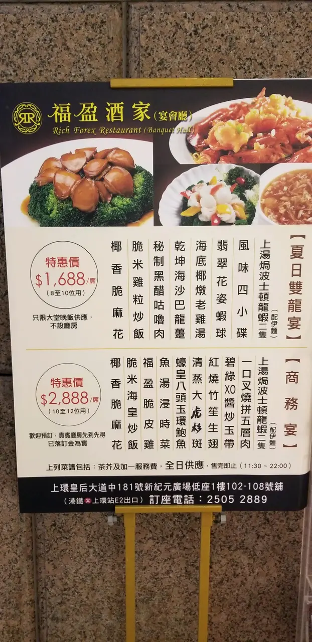 福盈酒家(宴會廳) (上環) 網址: https://s.openrice.com/QrbS0poK900 地址: 香港上環皇后大道中181號新紀元廣場低座1樓102-108號舖 電話: +852 25052889