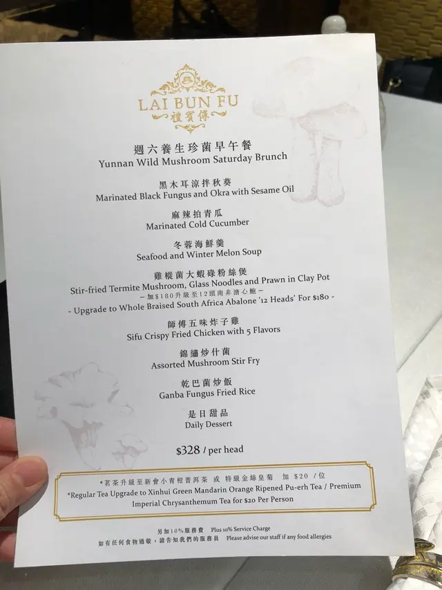 This restaurant offers authentic Cantonese cuisine, with Master Chung managing the kitchen, leveraging his vast experience working in the former Governor's House serving the local and overseas VIPs of the finest Cantonese dishes. Located in the heart of Central, the restaurant has a nice decor of contemporary design, with comfortable seats. There are also a private room but unfortunately the sound insulation is not sufficient to prevent the loud laughter keeps bombarding us from someone inside. We ordered the Deluxe Tasting Menu, with the first dish being the Steamed Crab Claw with Shaoxing Wine. Before arriving the fragrant smell of the wine already reached us, and the taste was quite phenomenal, with the crab claw of good size, and one can readily tell the crabs are live and not frozen. The savory flavor of the wine is a great match with the sweet and delicate taste of the crabs. A wonderful start for the dinner and setting up with a high expectation for the rest of the meal. The second dish is Pan-fried King Prawn with Premium Soy Sauce. The prawn has a beautiful golden brown color on the shell, pan-fried to a crisp texture but keeping the meat moist and tender. Apart from the soy sauce, there are also shallots and chili added to provide extra dimensions to the taste. Sounds simple, but how to balance well the richer flavors of the sauce not masking the prawn demonstrated the skills of the chef. The third dish is Minced Chicken and Bird's Nest Soup. Bird's nest is more commonly served as a dessert but a savory style is equally, if not more, delicious in my opinion. With the bird's nest absorbing the chicken stock, but offering a bit of bite on the mouthfeel, and with the minced chicken giving additional complement on texture. There are a few flakes of gold added to increase the premium and appeal as well. These three dishes delivered a three strike to my dining experience on the night. The fourth dish is Stir-fried Hokkaido Scallop with Asparagus and Truffle Paste. Again it looks simple, but immediately you can recognize the quality of the scallops being sashimi-grade. The asparagus, bell pepper and celery give an interesting contrast on texture, but personally I think the truffle is a bit too strong on its taste and a bit overpowering the more refined flavors of the other ingredients. But still I like the dish. The fifth dish is Braised 8 Heads South Africa Abalone with Goose Web. The abalone is certainly big in size, but it is a bit rubbery, which I believe is more the issue on the quality of the abalone than the culinary technique. The goose web is on the other hand very good, with the flavors infused well into the web, and braised to perfection. The choi sum is also a good complement. A bit of a disappointment but mainly because we got a high expectation as well. The sixth dish is Poached Mustard Green with Layer Bean Curd. The mustard green has been poached in the supreme stock, with the flavors seeped into the vegetable well, and there are a few wolfberry added to add both color and flavors. The layer bean curd also has absorbed the stock to give the same great taste. A nice dish overall. The seventh dish is Lai Bun Fu Signature Fried Rice, which got abalone, lobster, scallop, Chinese ham and black truffle. The rice is not overly stir-fried to completely dry, maintaining a slightly moist style. The piece of abalone is big but the others are quite finely chopped so I could not readily tell their presence. The taste is good but again I think the use of black truffle needs to be careful as the aroma is too powerful and can easily dominate the whole experience. The last dish is the Daily Sweet Soup, and today it was the Walnut Soup. It is prepared in-house and not coming from ready-made ones, with an appropriate sweetness to more tailored to the current healthy palate of customers. A nice conclusion to a good meal.Apart from the noise, generally the service and ambiance is satisfactory for a high-end Chinese restaurant. The toilet however is a bit unclean and this should be something the restaurant needs to be careful, as it can seriously downgraded the overall experience. With the bill totaling $2620 it is a bit high on price but still considering the premium ingredients they have used it is not unreasonable.查看更多