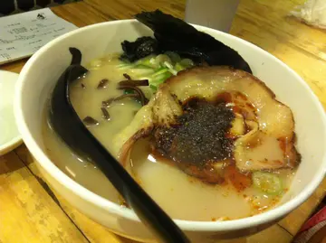 團購100元餐券。看到評語己有點失望, 但口味好個人, 不竟是車胎人....點了黑秀拉麵餐(麵+餃子10只), 湯底沒有其他評語所講咁咸, 但一定不值有車胎人美譽; 之後加湯後像喝麵豉湯; 肉是肉粒不是一片的;有肥有瘦, 但吃不出是烤的煎餃子不是脆身; 附上醬料帶點辣, 層次豐富一點,填補餃子的不足吧另試了友人 博多元祖拉麵的湯底, 只覺是湯一口, 沒有特別濃厚感覺, 反而豬頸肉不錯, 肥瘦適中