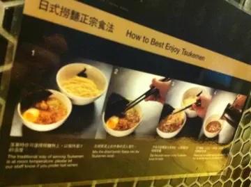 這家在中環的拉麵店,坐落鏞記旁,外部裝修毫不馬虎,光是在對面馬路就見到它的氣勢裡面也不同於一般拉麵店,一點也不迫,位與位之間讓人坐得很舒服,開放式廚房令人不用擔心食物衛生,吃得安心牆上貼有吃沾麵教學,很貼心:)先來的是赤秀沾麵,麵質一般,料亦不多但湯底濃稠度適中,辣度剛好可以刺激味蕾,令人不停吃~