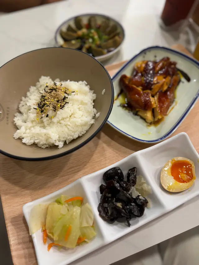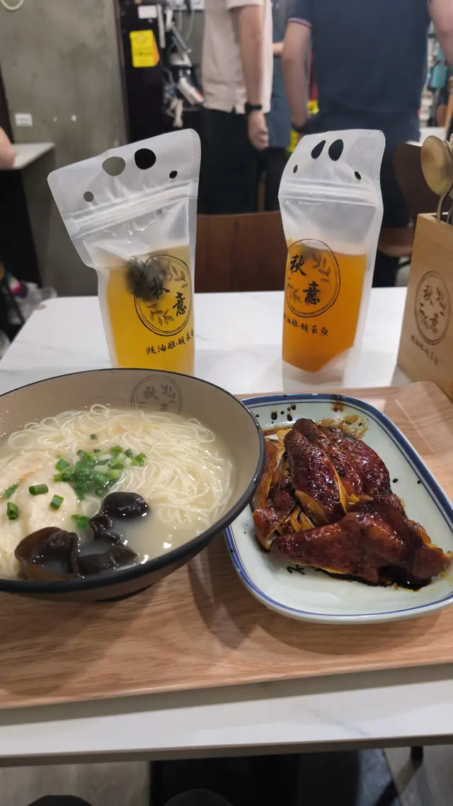 秋意去骨豉油雞 轉淨胸去骨雞胸肉經過精心處理,肉質鮮嫩多汁,咬下去時口感滑順,令人滿意。豉油的鹹香味道十分入味,增添了風味,讓每一口都能感受到醬汁的濃郁。豉油的味道與雞肉的原味相得益彰,讓整道菜的風味更加和諧。配蝦蝦冷拌麵麵條煮得恰到好處,口感滑順,帶有彈性,讓人一口接一口,十分過癮;味道醇厚,略帶鹹香,與麵條的口感相得益彰,讓人感到滿足。熱飲 生薑蜜生薑的辛辣味道十分明顯,帶來了溫暖的感覺。蜜糖的甜味平衡了生薑的辛辣,讓整體口感更加柔和,令人感到舒心。酒釀溏心蛋經過精心煮製,口感柔滑,溏心蛋黃的質地恰到好處,流心的口感讓人驚喜,帶有濃郁的風味。酒釀的香氣為整道菜增添了獨特的風味,甜中帶有微微的酒香,讓人感到溫暖。Shake shake 芥蘭芥蘭的鮮綠色澤讓人食慾大開,口感脆嫩,咬下去時十分爽口,保留了蔬菜的原汁原味。清蒸的做法讓芥蘭保持了自然的香氣,清爽宜人,十分適合搭配重口味的醬汁。醬汁的味道濃郁,融合了香、鹹、微辣的元素,為芥蘭增添了額外的風味層次。…查看更多