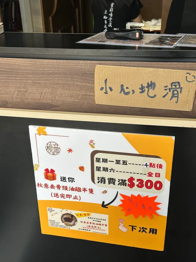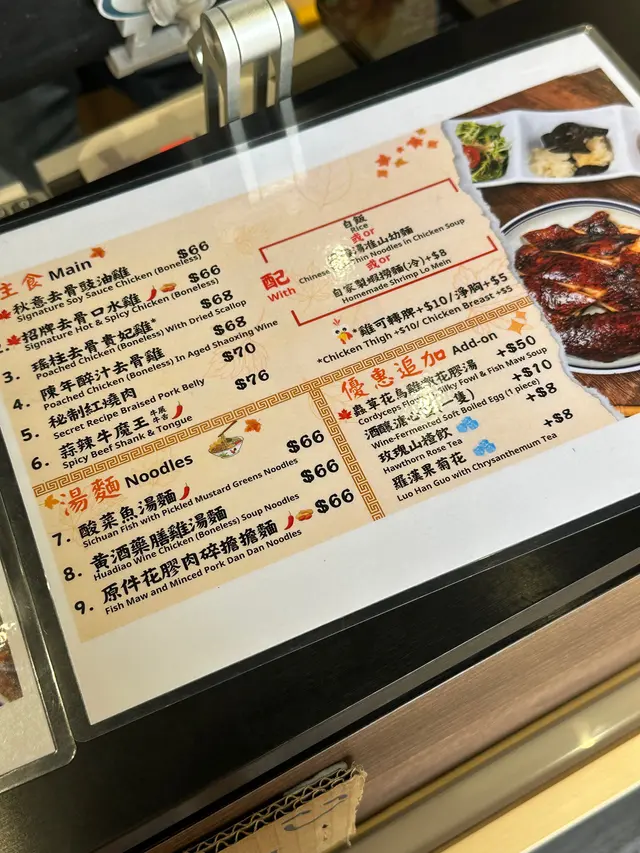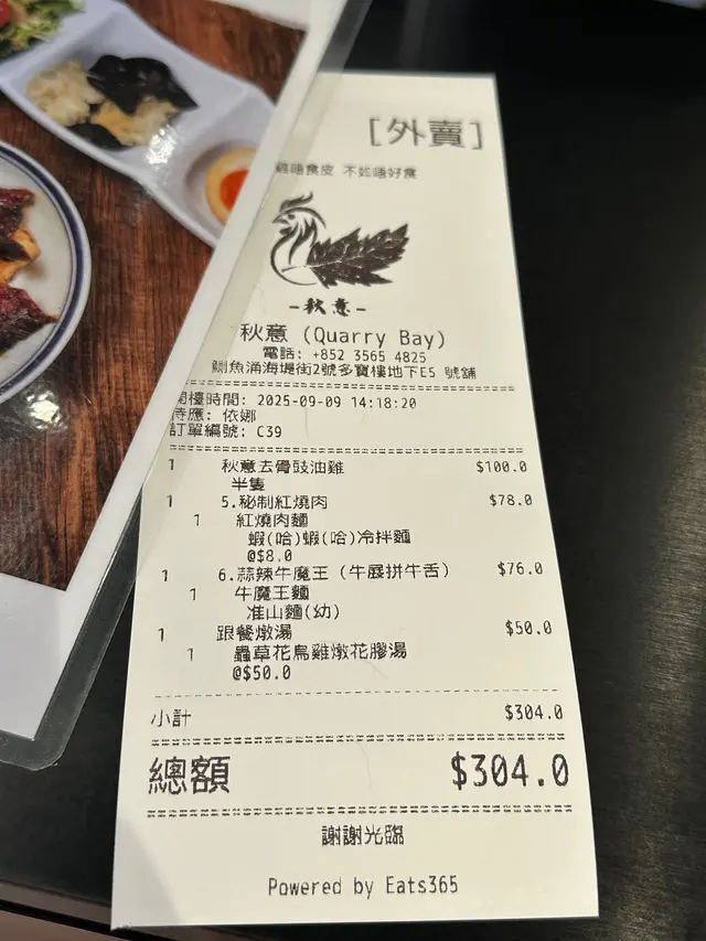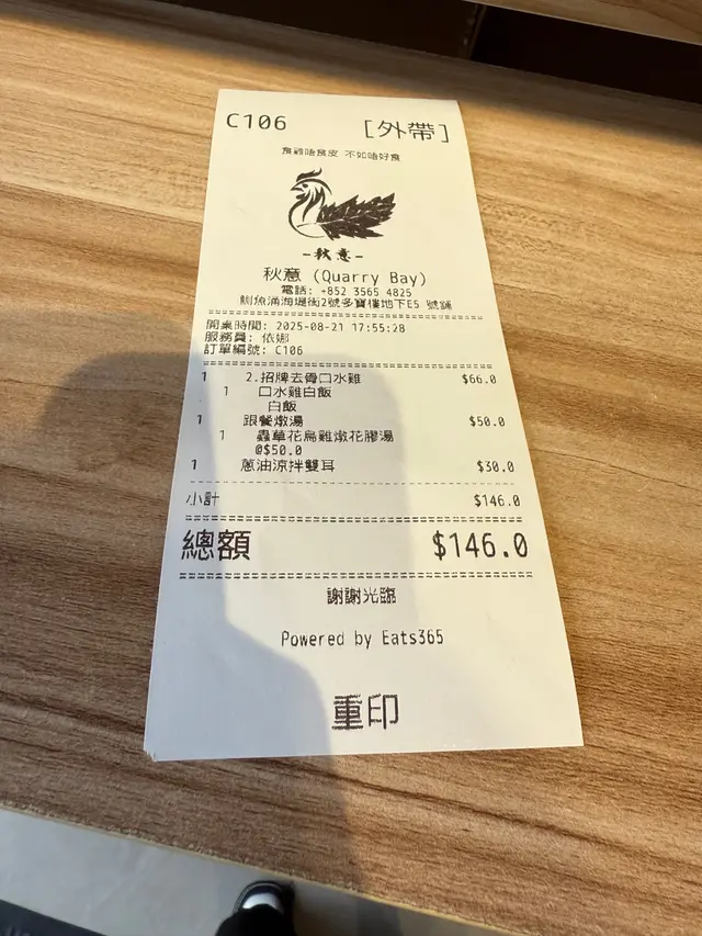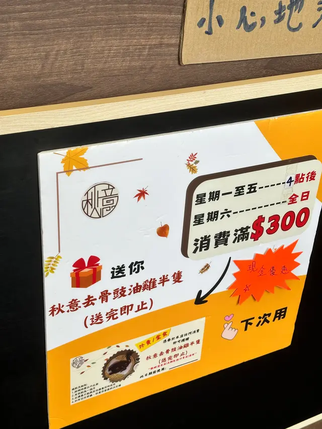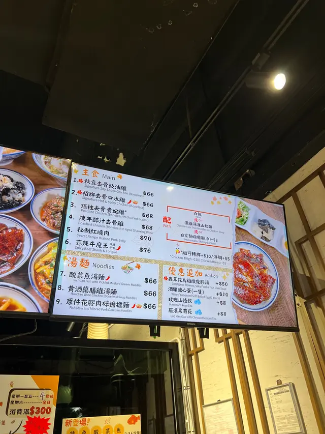 計劃趕不上預期,原本約了好友一起吃飯,但朋友臨時腸胃炎去不了。因而變咗鰂魚湧附近買外賣回家跟老婆一起吃秋意於鰂魚涌海堤街,地鐵站出發大約七分鐘便到,地點方便就腳。我們一行二人共點了幾樣不同菜色,一起互相分享。瑤柱去骨貴妃雞(⭐⭐⭐⭐⭐)貴妃雞是這裏的名菜,來到一定要一試。肉質嫩滑,而且外皮爽口,配上面頭的瑤柱,令人停不了口。我們叫的是半隻,份量都算大碟,二至三人分享剛剛好。酸菜魚淮山麵(⭐⭐⭐⭐⭐)酸菜魚一共有七至八片,吃起來爽口而且無骨,啖啖肉。配上微微辣的湯底,令人食慾大增。蟲草花烏雞燉花膠湯(⭐⭐⭐⭐⭐)這個燉湯是跟餐配搭,$50十分抵。花膠大大件,而且吃起來十分厚身。配上蟲草花、龍眼肉等不同材料,湯味濃郁,令人回味無窮。蔥油涼拌雙耳(⭐⭐⭐⭐⭐)這裏的雙耳是木耳和雲耳,吃起來爽口。配上蔥油作為點綴,吃起來更加野味。總括而言,這間餐廳食物質素不錯,而且價錢十分大眾化。下次經過也一定會再來。~~~~~~~~~~~~~~~~~~~~~~~~秋意 鰂魚涌海堤街2號多寶樓地下E5號舖推介菜式:瑤柱去骨貴妃雞👍🏻地點方便👍🏻價錢大眾…查看更多