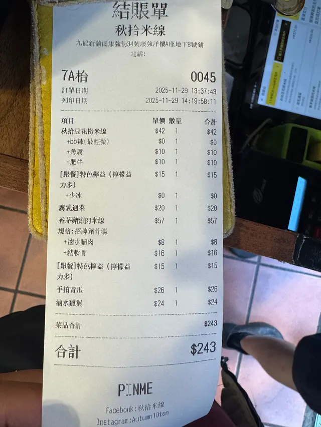 秋拾米線 (新蒲崗) 網址: https://s.openrice.com/QrbS0ct0C00 地址: 香港新蒲崗康強街34號康強洋樓A座地下8號舖 電話: +852 34888021