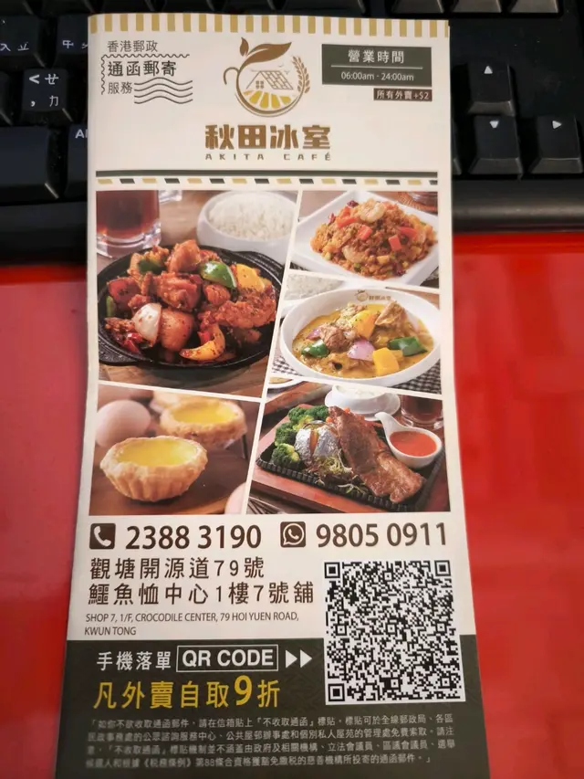 公司附近觀塘鱷魚恤中心新開左間秋田冰室,上網搵先見到原來調景嶺都有一間... 新開第一日已經見到好多人試..可能新野啦..第一日拎左佢地餐單紙,價錢比起其他附近冰室/茶記可能貴少少, 不過贏在位置方便, 尤其落大雨嘅時候就最方便,而且佢都有新鮮出爐既麵包, 唔想食太飽揀佢都係一個唔錯既選擇。(6月29日)外賣自取佢地個沙爹牛麵早餐, d牛都算嫩, 沙爹醬都算多, 如果少d湯會更加濃味。 檸茶茶底正常, 個人唯一覺得唔好就係個餐包, 個面太多芝麻 (個人唔鐘意芝麻), 如果有芝麻控既朋友就可能岩d . 同埋周邊茶記通常除左蛋會再配腸仔/火腿, 而哩間只有炒蛋+餐包值得一讚係佢地出餐速度,我落單後5-6分鐘已經拎得, 比我想像中快,good.有機會會再試佢其他食品查看更多