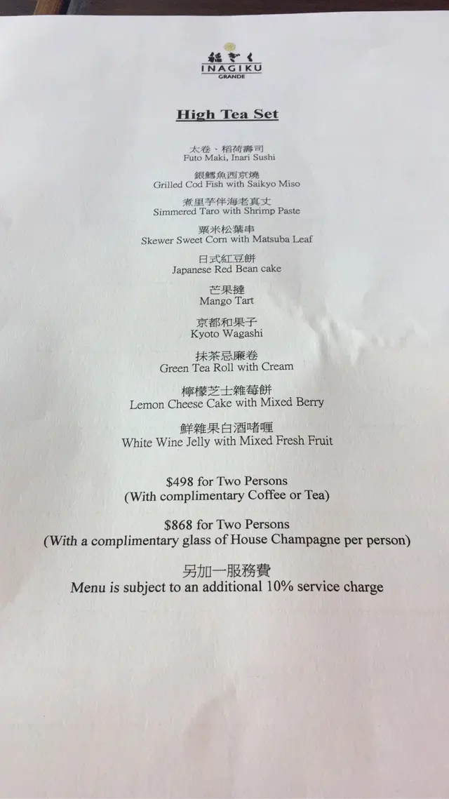 為慶祝朋友生日,所以訂左四季酒店嘅「稻」菊食個日式下午茶。一如其他頂級酒店,餐廳裝修高雅。由於朋友唔飲香檳,所以我地要個$498/2位嘅tea set. 如果想飲香檳,就要點$868/2位嘅set.Tea set分左兩輪奉上,第一碟賣相精緻。季節壽司質素一般;天婦羅櫻花蝦應該係一早炸起,上碟時已淋哂和風汁煮白梅貝,味道似用左好多豉油去煮,味道一般日式蛋卷配明太子充滿蛋香後上的甜品拼盤美得像一幅畫鮮忌廉卷加入芒果,口感清新抹茶紅豆餅是這裏出名的甜點,果然名不虛傳。抹茶味濃,紅豆甜度恰到好處,係水準極高嘅甜品。藍莓芝士蛋糕和朱古力亦係水準之作。蝴蝶酥係淋嘅。日式啫喱無乜味經常聽同事講稻菊質素一流,仲諗住朋友生日要食好啲,但今次幾失望。呢度環境一流,望住維港進餐的確令人心情愉快。侍應亦細心,達到五星酒店的水平。可是食物質素不如預期般好,只有個別食物做得美味。