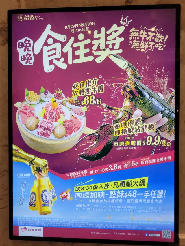 2025年9月5日 星期五終於放完大假呢幾日開始返工真係有啲攰,而且天氣實在太熱,連屋企人都無心機煮飯,於是乎夜晚直接出街食飯最後選擇左稻香既晚市,因為餐廳到8點半後入座火鍋湯底有半價優惠,而且其他食物都只係3.8折,真係抵到爛,回歸90年代既價錢,所以就決定齊齊打邊爐同場仲有小活動環節,只要$48就可以參加一次,需要30秒內用單手任拎啤酒,能夠堅持10秒就得,拎幾多支就送幾多支,而且如果拎到7支就可以另外用$9.9加購一隻新鮮龍蝦添,真係好吸引我哋當然唔執輸即刻排隊參加,最後都好彩成功拎到5支,平均每支啤酒都只係$9左右,夠抵飲講返個火鍋,我哋要左菌皇竹笙鍋,一打開蓋就聞到陣陣菇香,湯底清澈但味道濃郁,而且帶有淡淡草本氣息竹笙爽脆,吸收晒菇湯精華,各款菇類都層次分明,口感由嫩到彈,齒頰留香,飲完湯有種身心舒暢嘅感覺唔洗幾耐所有野食都已經到齊,十分豐富,擺滿晒成張枱當中最吸引既當然係呢個安格斯牛盤,除咗因為價錢由$168到現在優惠價$68之外,牛肉切得薄而均勻,油花分佈靚到好似大理石咁,落鍋一燙即熟,入口嫩滑得嚟又唔失牛味,啖啖都係肉香同脂香交織嘅享受配埋牛筋、牛肚同肉丸,口感層次豐富,好似黎左一次牛肉界巡禮咁之後有五福蔬菜籃,色彩繽紛又新鮮,菇菌香氣自然,粟米甜得嚟又有啲脆,南瓜綿密帶些微甘,白菜爽口唔澀,仲有啲生菜同蕃茄點綴,落鍋一煮,湯底即刻升級,清新得嚟又唔失層次,啱晒打邊爐時平衡油膩呢個係半隻地雞,雞皮呈天然黃金色,睇落已經好吸引淥熟之後,雞肉嫩滑得嚟又有咬口,唔會粉粉地脂肪分布平均,食落唔油膩但又夠香,冇腥味,啖啖都係雞味,唔靠醬料都好好食最後由左至右分別係手打蝦滑、墨魚滑同手打鯪魚滑,蝦滑入口爽彈,蝦肉鮮甜得嚟帶少少海水味,咬落去有啲爆汁感,唔使點醬都夠味,啖啖都係真材實料,而墨魚滑就質感煙韌,咬落去有啲彈牙,味道偏清淡但有淡淡海鮮香,啲墨魚粒粒分佈平均,口感層次豐富鯪魚滑則比較粗獷,魚味濃郁,仲有啲微微嘅薑香,口感冇咁滑但好實在,啲魚骨已經打碎晒,食落唔怕卡喉埋單五個人都唔使$600,真係好抵食!!…查看更多