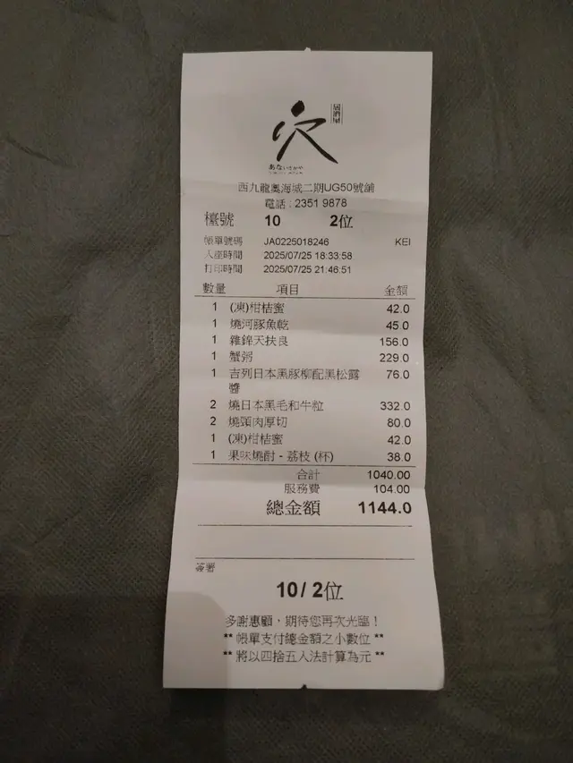 睇電視節目推介, 見主持介紹嘅食物好似好正, 就即刻 book枱食晚飯 ! 落單嘅男侍應完全唔掂,冇禮貌兼講嘢一舊舊, 又好似聽唔到我地講乜咁! 最終我哋點嘅牛脷無嚟到,應該佢無落到單。點咗個蟹粥, 好似啲bb仔食嘅糊咁樣,冇乜味杰撻撻, 粥內只有兩嚿好細嘅蟹腳同蟹殼,好核突, 同個侍應講叫佢反映畀廚房聽,佢話冇辦法 ,廚房有時做到好稀有時又做到好杰!咁樣都得嘅, 既然經常做得咁差就咪鬼出呢一個餐啦! 點咗個雜錦天婦羅, 個脆漿完全唔掂! 最後點咗香檳荔枝,嘩.....完全冇荔枝味 ,個香檳係乸喉嘅 ,真係未飲過咁難飲嘅飲品。 串燒豬頸肉 ,真係未食過冇底味嘅豬頸肉 ,肉質係實的的乾爭爭!結論佢收嘅價錢完全唔配。值得推介的只有燒河豚魚乾 ,黑毛和牛粒串燒!點咗六個菜只有兩個菜好食,三杯飲品都唔得 ,咁大家自己諗下會唔會去幫襯喇!…查看更多