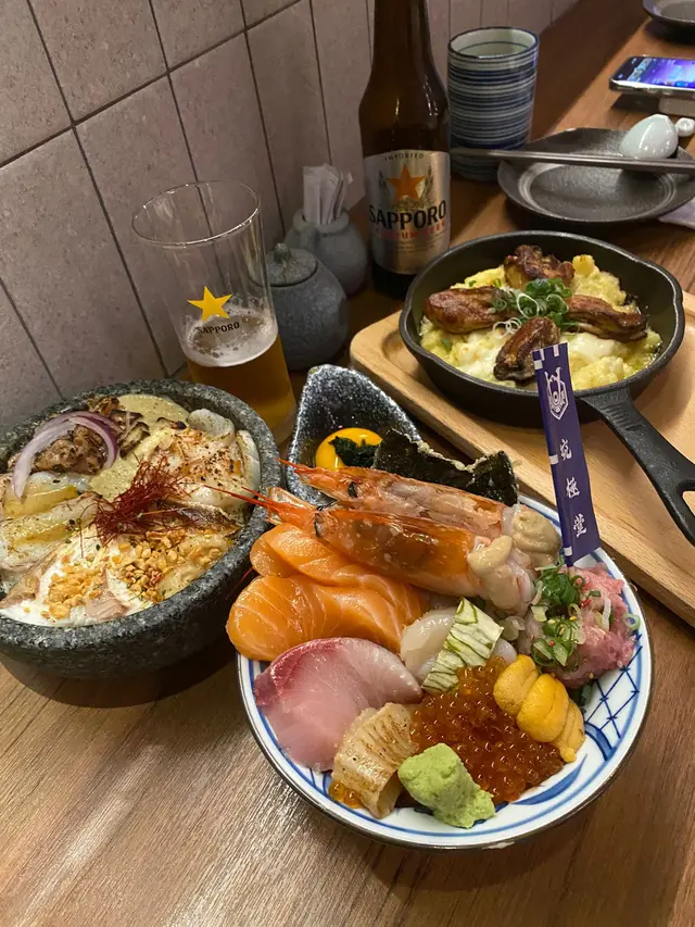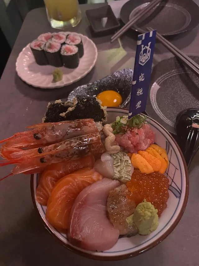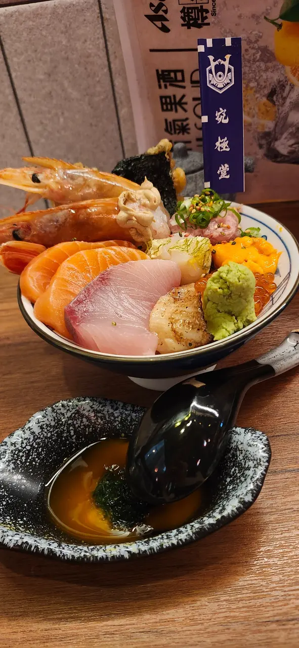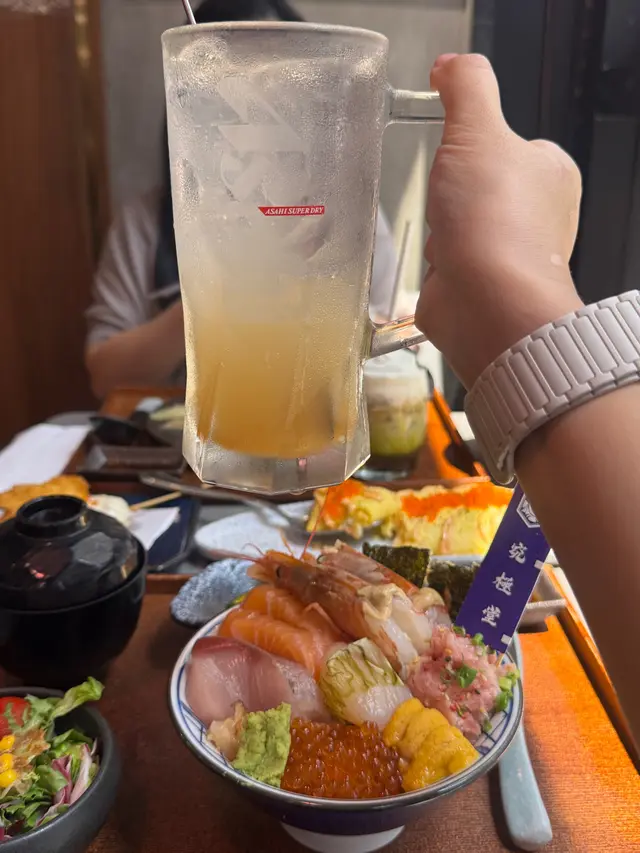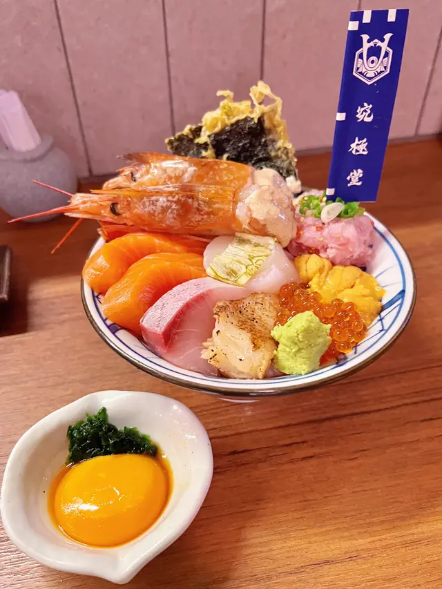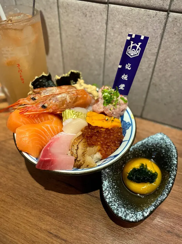 朋友話辛苦搵嚟志在食,所以,奢華少少嗌咗個「究極丼」,可惜喺海膽剛無貨,但會用番時令刺身補上。睇見份丼真喺好吸引,有帶子、三文魚籽、炙燒左口魚、油甘魚、三文魚、赤身、拖羅蓉、大赤蝦,仲搭上一隻蛋香十足嘅蘭王蛋,外觀非常吸晴。佢話啲刺身好新鮮,味道鮮甜,每款刺身都超好食,真喺無咩挑剔位,夠晒足料,物超所值。