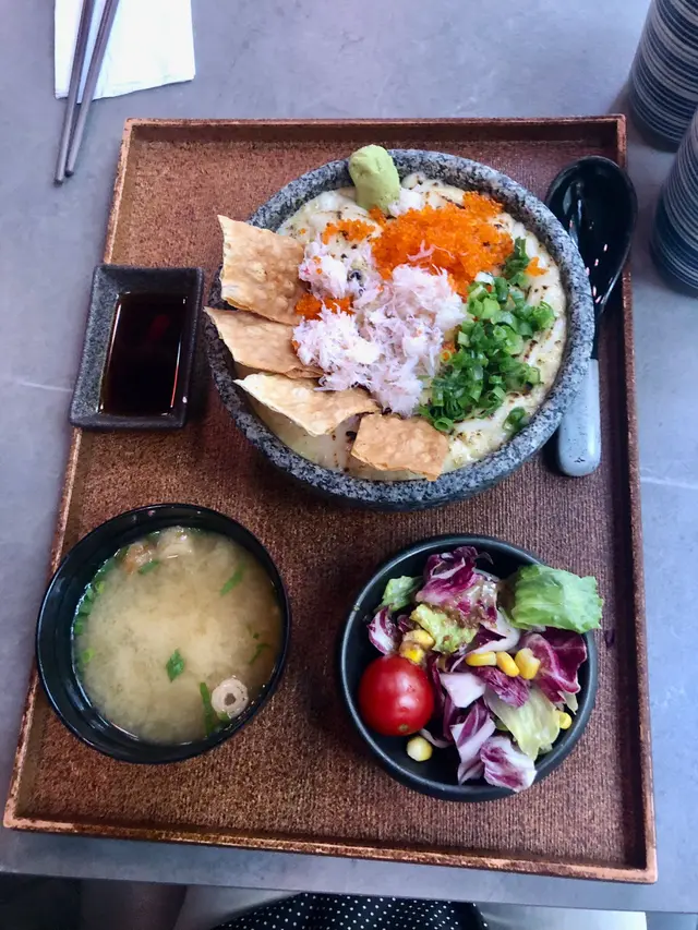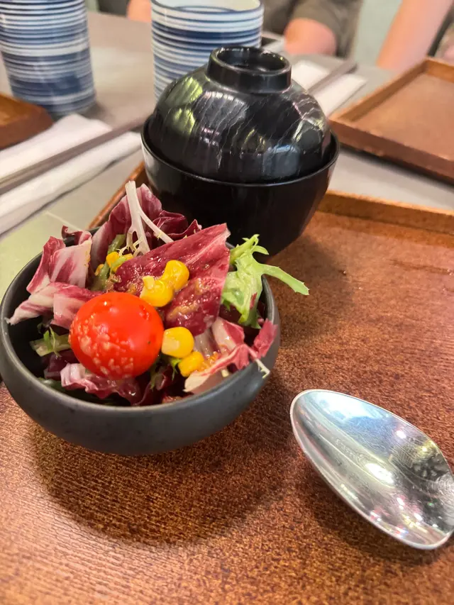 而小弟嘅炎之丼跟朋友嘅差唔多,當然,用料無佢嗰個咁高檔,但一啲都唔失禮,有左口魚、黑鯥、甜蝦、吞拿魚蓉、油甘同帶子,全部都炙燒過,入口帶點點焦香感,同樣食得出食材新鮮,又能一次過試到多款刺身。此外,所有定食都包埋田園沙律同麵豉湯,以一頓午餐而言,已喺豐富至極。成日都講,只要做出水準,不愁無客,兩個丼都食得出用料不賴,所以,午市基本上都可以講全場滿座!…查看更多